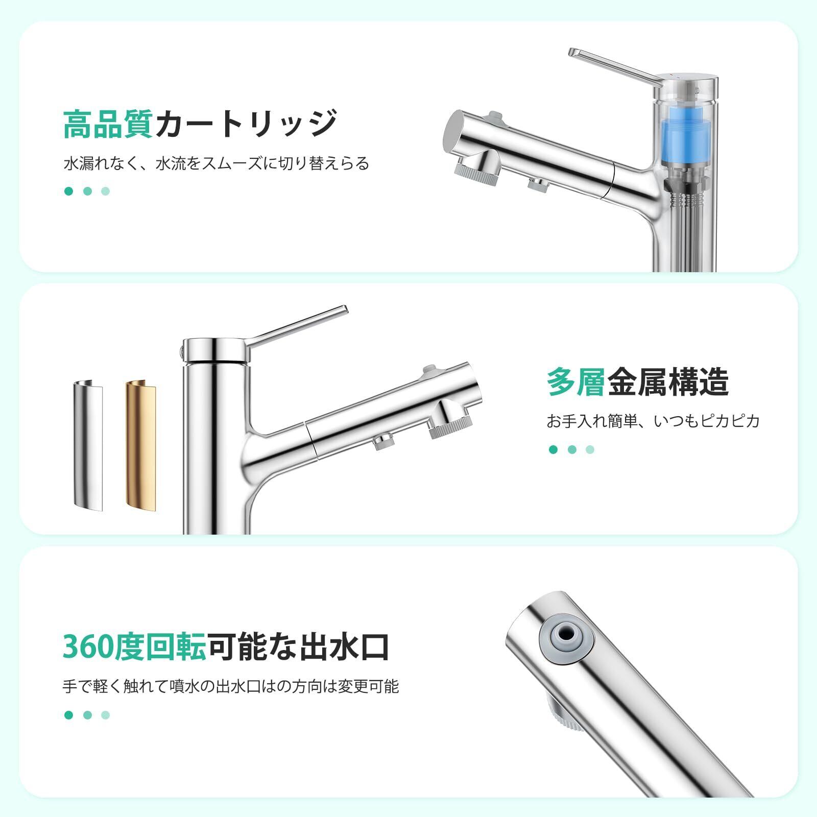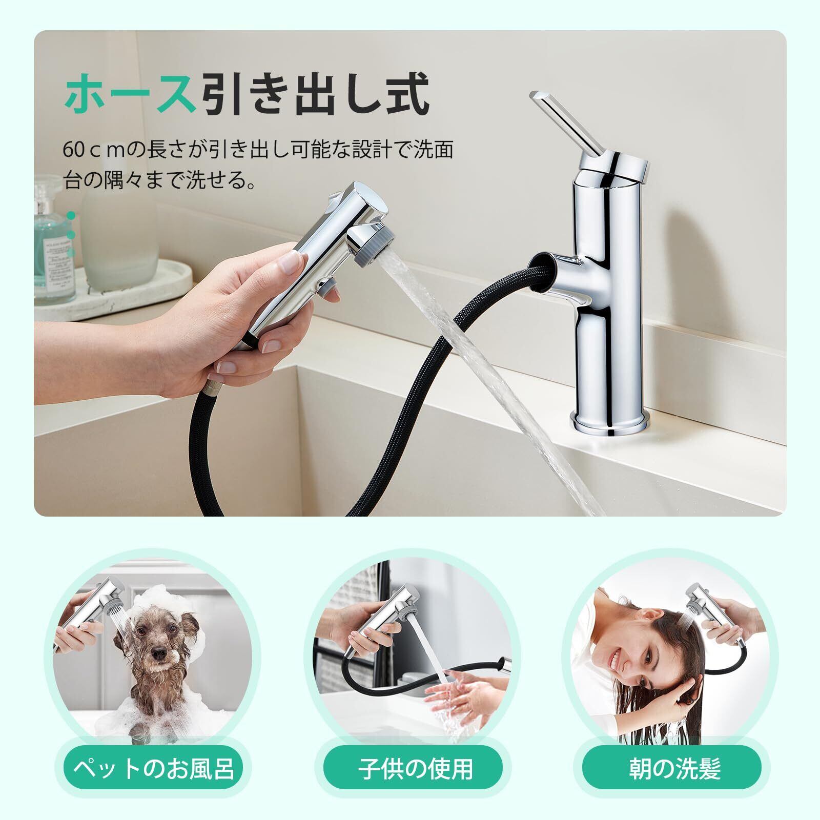ホース引き出し式:水栓の先端のホースは約60cmまで引き出し式可能、洗面台に自由に伸縮可能で、洗面台の隅々までお掃除することも楽々です。シャワーモードと組み合わせることで、朝の洗髪にも便利です。