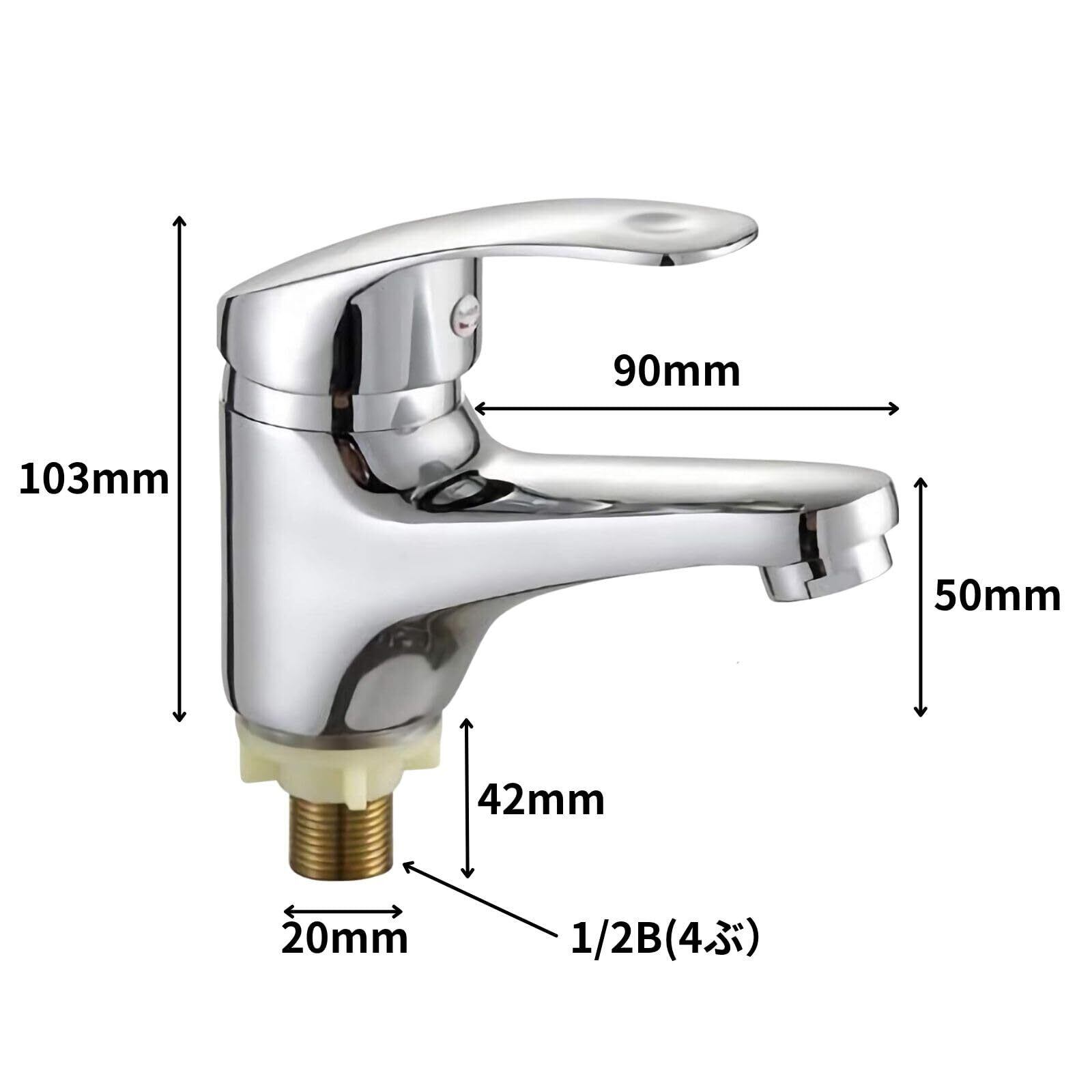 商品設置サイズ:高さ/103mm 吐水口長さ90mm 吐水口高さ50mm 取り付けネジ径/20mm 取り付けネジ長さ/42mm 取り付け穴径は、最小21mm~最大30mm