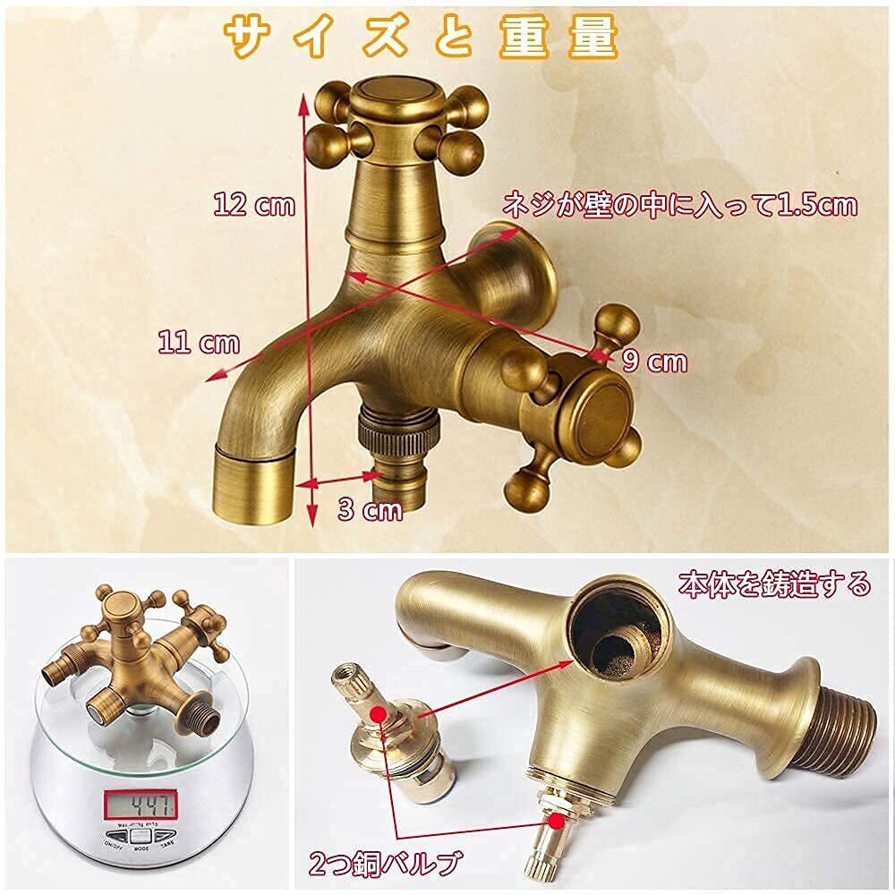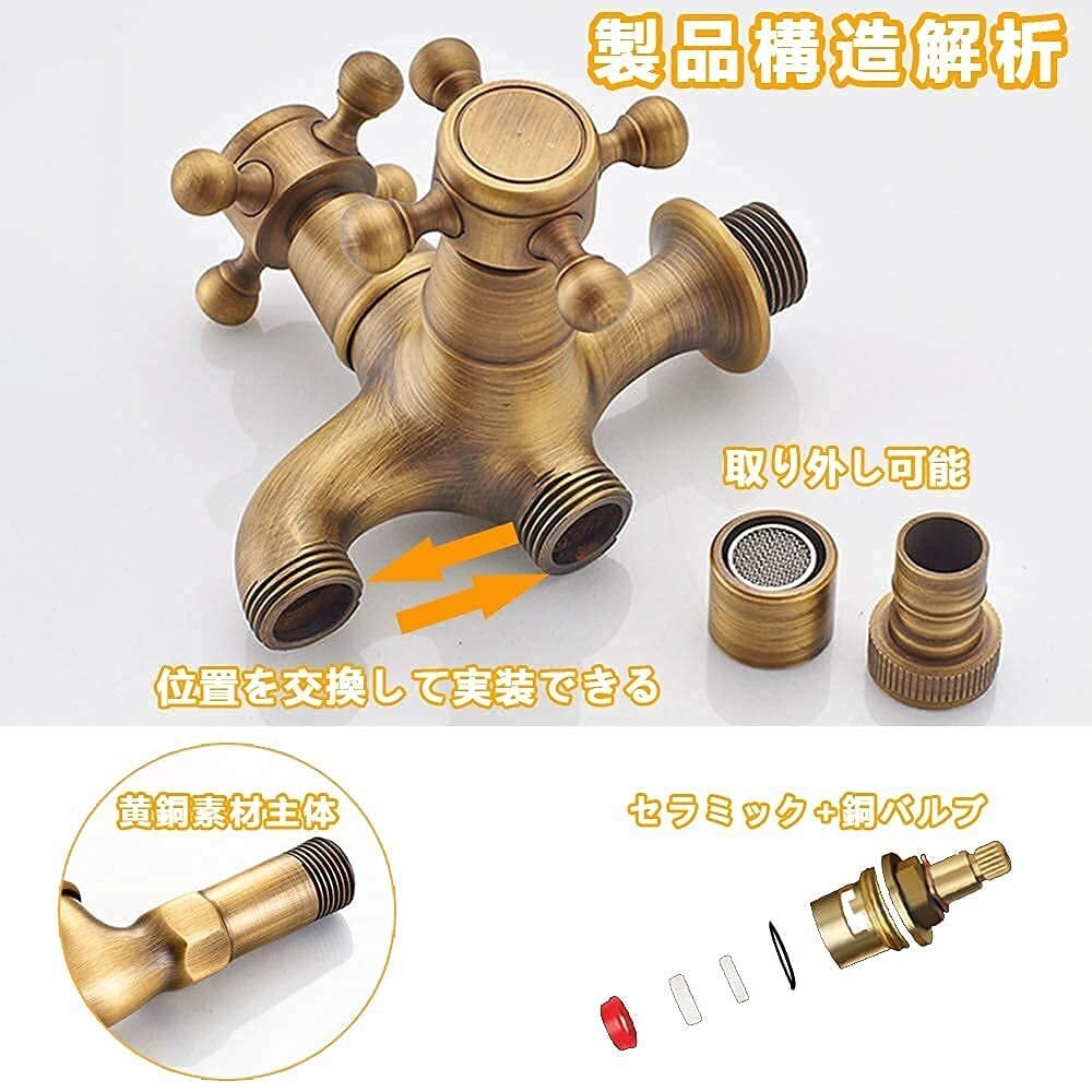 【 レトロ スタイル】双口水栓北欧風 アンティーク レトロ スタイル、古ぼけた レトロ 感のある 真鍮色 。銅の原色の外観は、とても独特で、多くの人はその優雅な外観に惹かれます。タイプ:2口水栓。マックス旋回角度:1/4回転。インレットアウトレットネジサイズ:G1 / 2。適切なホースサイズ:G1 / 2。とても便利で、オシャレなクラシカル蛇口です。