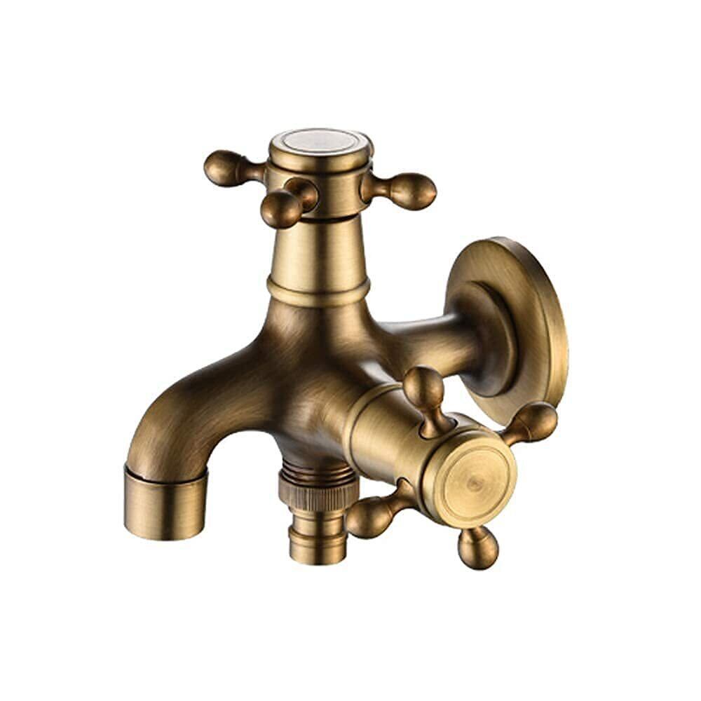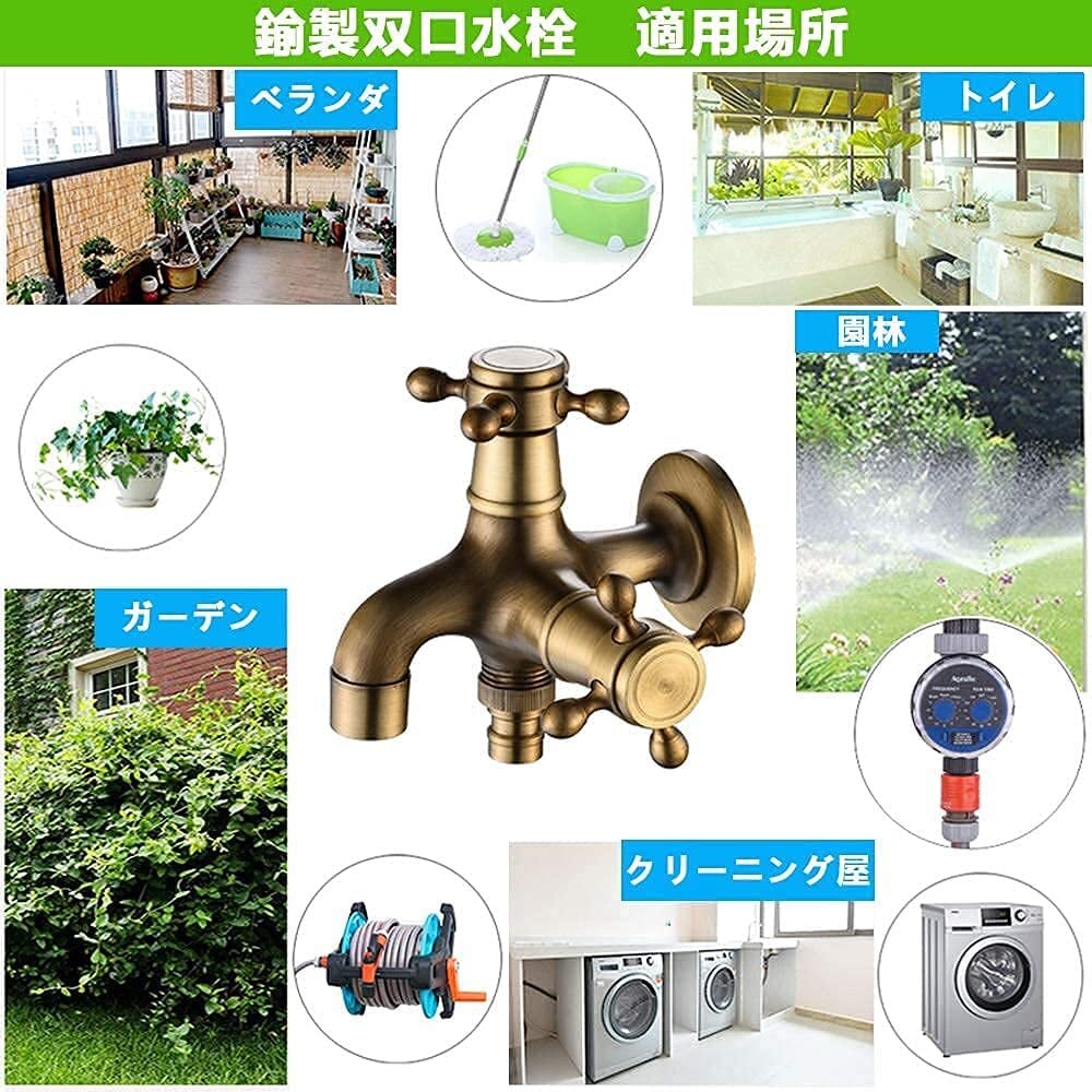 双口 水栓 2口 蛇口 北欧風 アンティーク レトロ スタイル 水道 分配 真鍮製 2口 タイプ 洗濯機の蛇口 浴室ベランダガーデン ガーデン 屋外用水栓(Herischen)