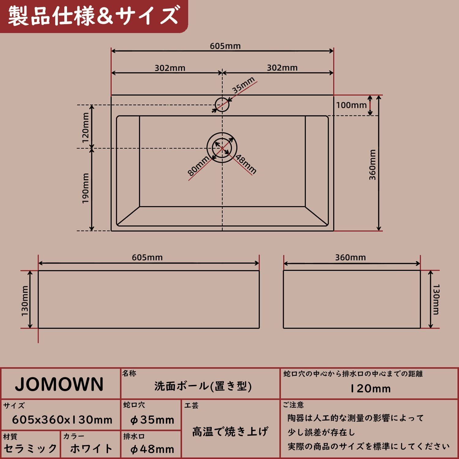 【高品質&掃除しやすい】:JOMOWNの 大型 洗面ボールは1280℃以上の高温で焼き上げております。 伝統工芸とモダンのデザインを組み合わせる白い洗面ボウルは洗面所の全体が清潔でシャープな印象を残しやすいです。洗面器の表面には釉薬が採用して、滑らかで光沢があります。表面が滑らかで汚れが溜まりにくいので、サッとふくだけで、きれいになります。