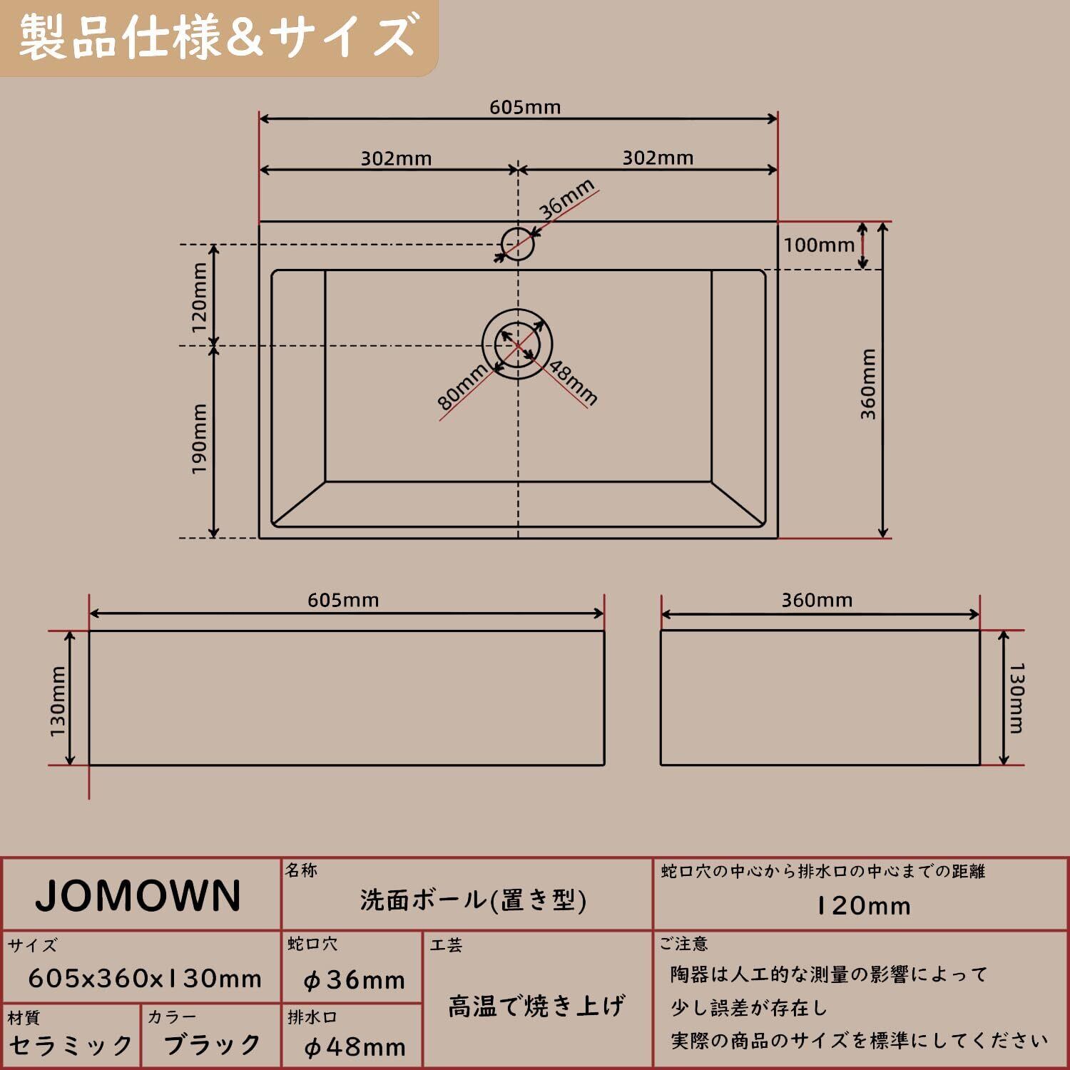 【高品質&掃除しやすい】:JOMOWNの洗面ボウルは1280℃以上の高温で焼き上げております。 伝統工芸とモダンのデザインを組み合わせる黒い洗面ボウルは洗面所の全体が清潔でシャープな印象を残しやすいです。洗面器の表面には釉薬が採用して、滑らかで光沢があります。表面が滑らかで汚れが溜まりにくいので、サッとふくだけで、きれいになります。
