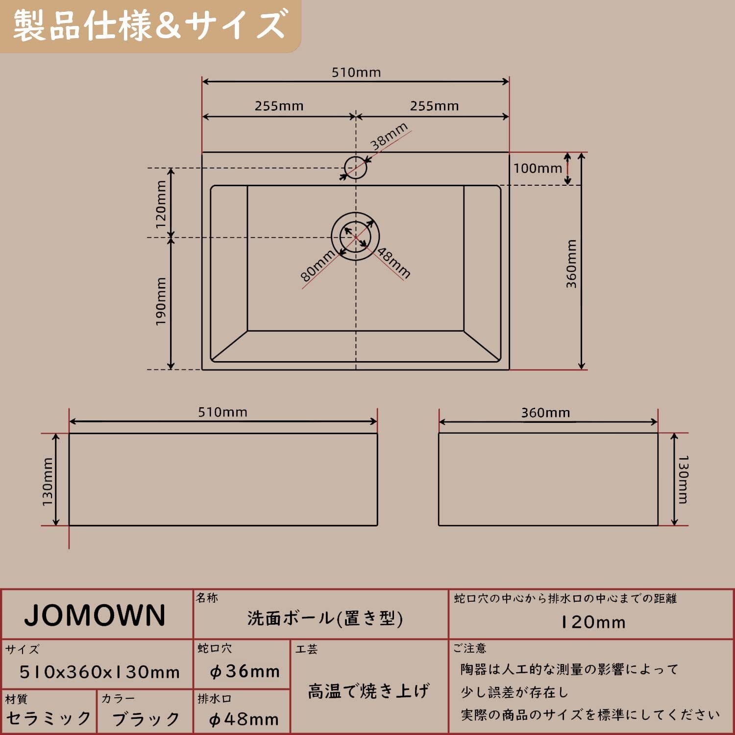 【高品質&掃除しやすい】:JOMOWNの大型洗面ボールは1280℃以上の高温で焼き上げております。 伝統工芸とモダンのデザインを組み合わせる黒い洗面ボウルは洗面所の全体が清潔でシャープな印象を残しやすいです。洗面器の表面には釉薬が採用して、滑らかで光沢があります。表面が滑らかで汚れが溜まりにくいので、サッとふくだけで、きれいになります。
