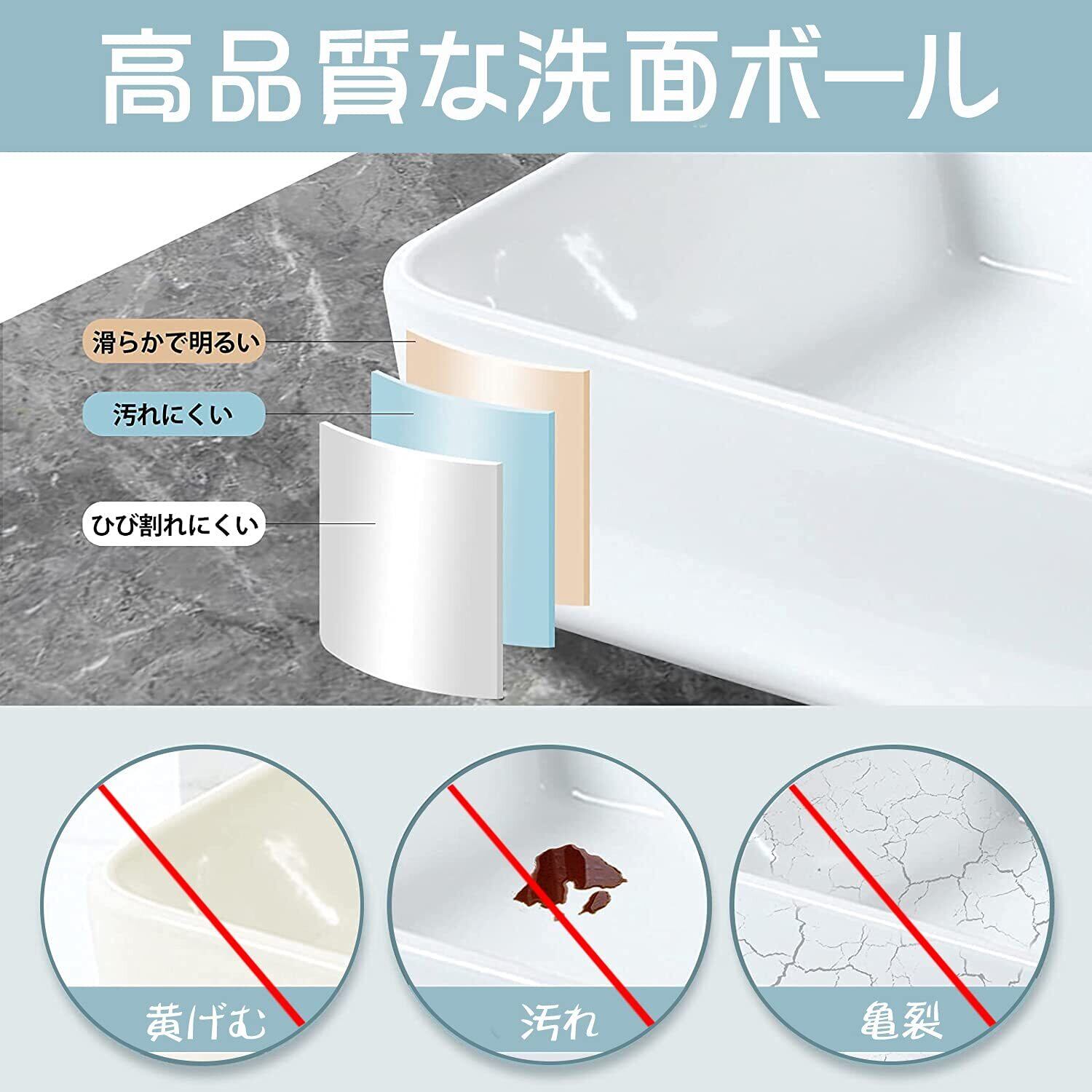 【高品質の粘土材料】高品質な環境にやさしい原料を使用しています。体に有害な物質を加えられません。また白色光沢のエナメルは洗面ボウルの色が変らないよう保護します。長期間に使用しても新しく見えます