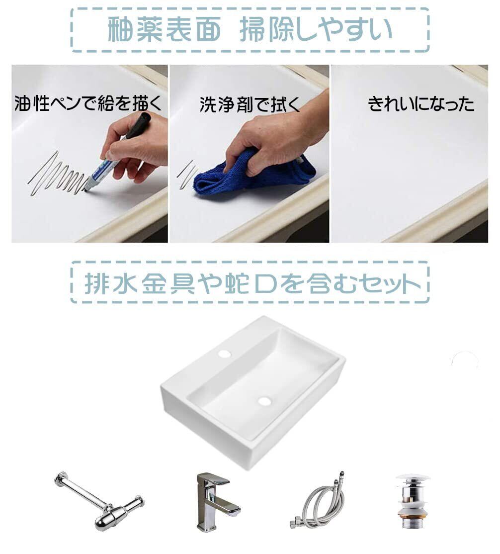 【高級排水セット付き】洗面ボウル 陶器 洗面ボール セット おしゃれ 手洗い器 洗面台 四角型 手洗い鉢 高温焼成 白陶器製 高級排水金具付き トイレ キッチン 和風 洋風 室内 室外(長方形セット)(3-4日到着予定)