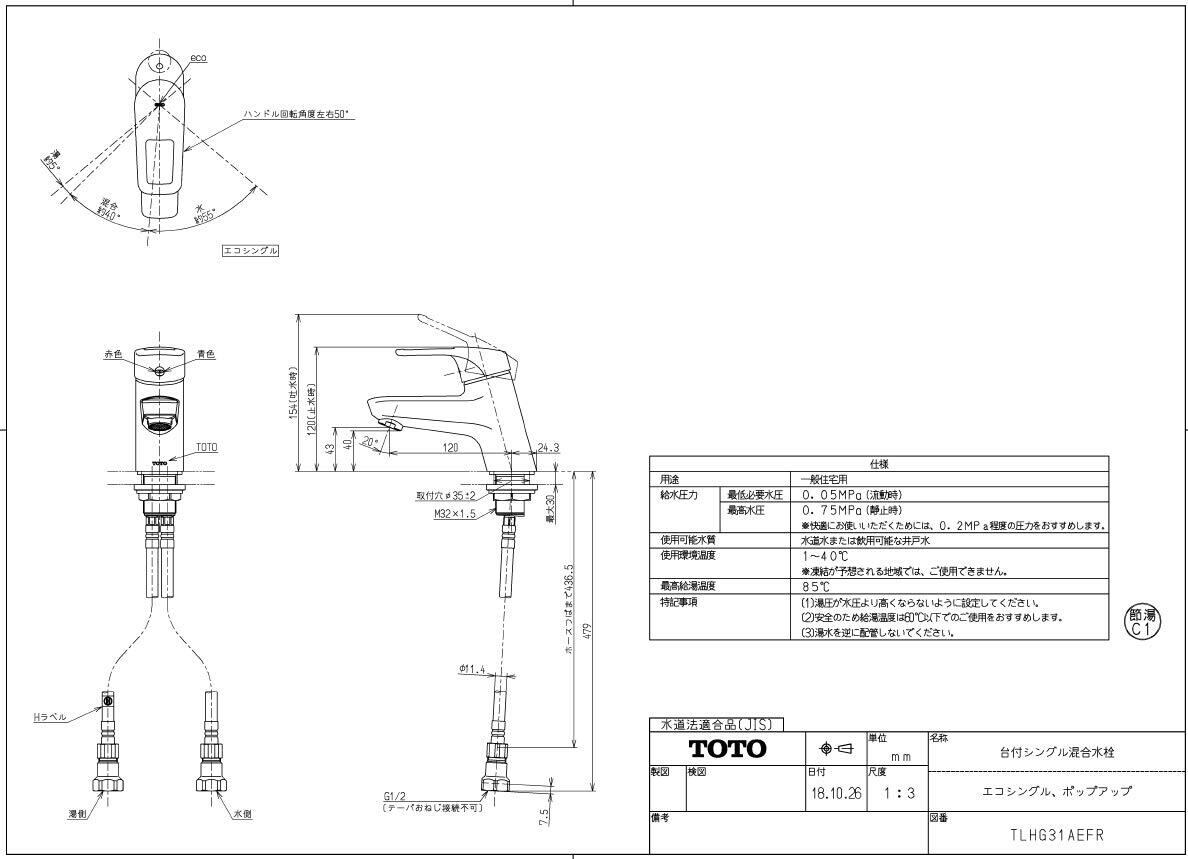 TOTO 洗面所水栓 台付1穴・エコシングル ポップアップ式(取替用) TLHG31AEFR