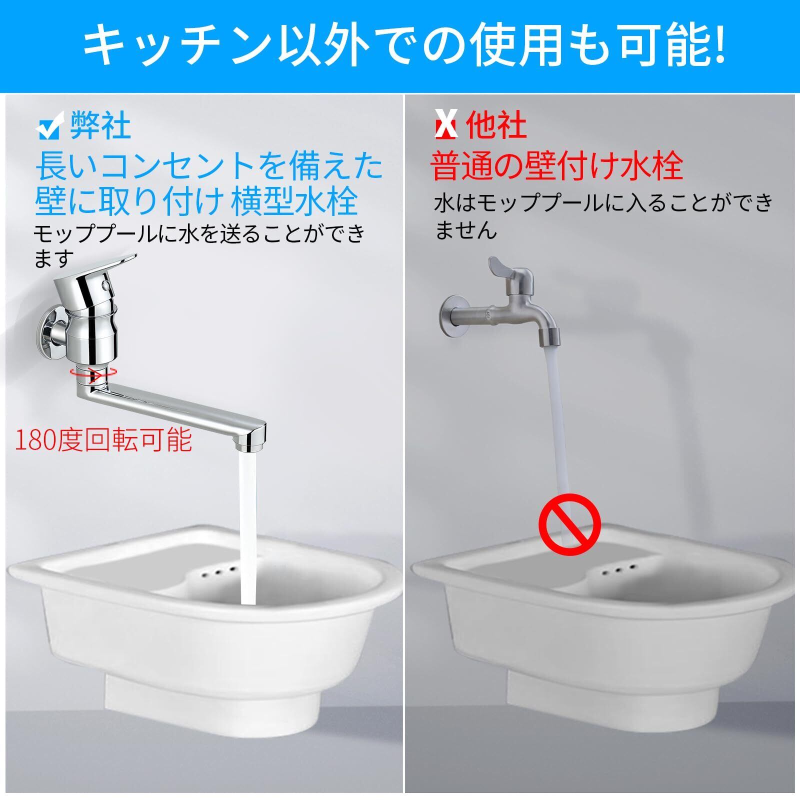 【横型自在水栓 360度回転&簡単脱着】横水栓の吐水口は360度回転可能(設置後は180度調整)。パイプを簡単に脱着できるため、手洗いボウルやシンクのスペースに合わせて自由に配置可能。給水パイプの長さは18cmです。