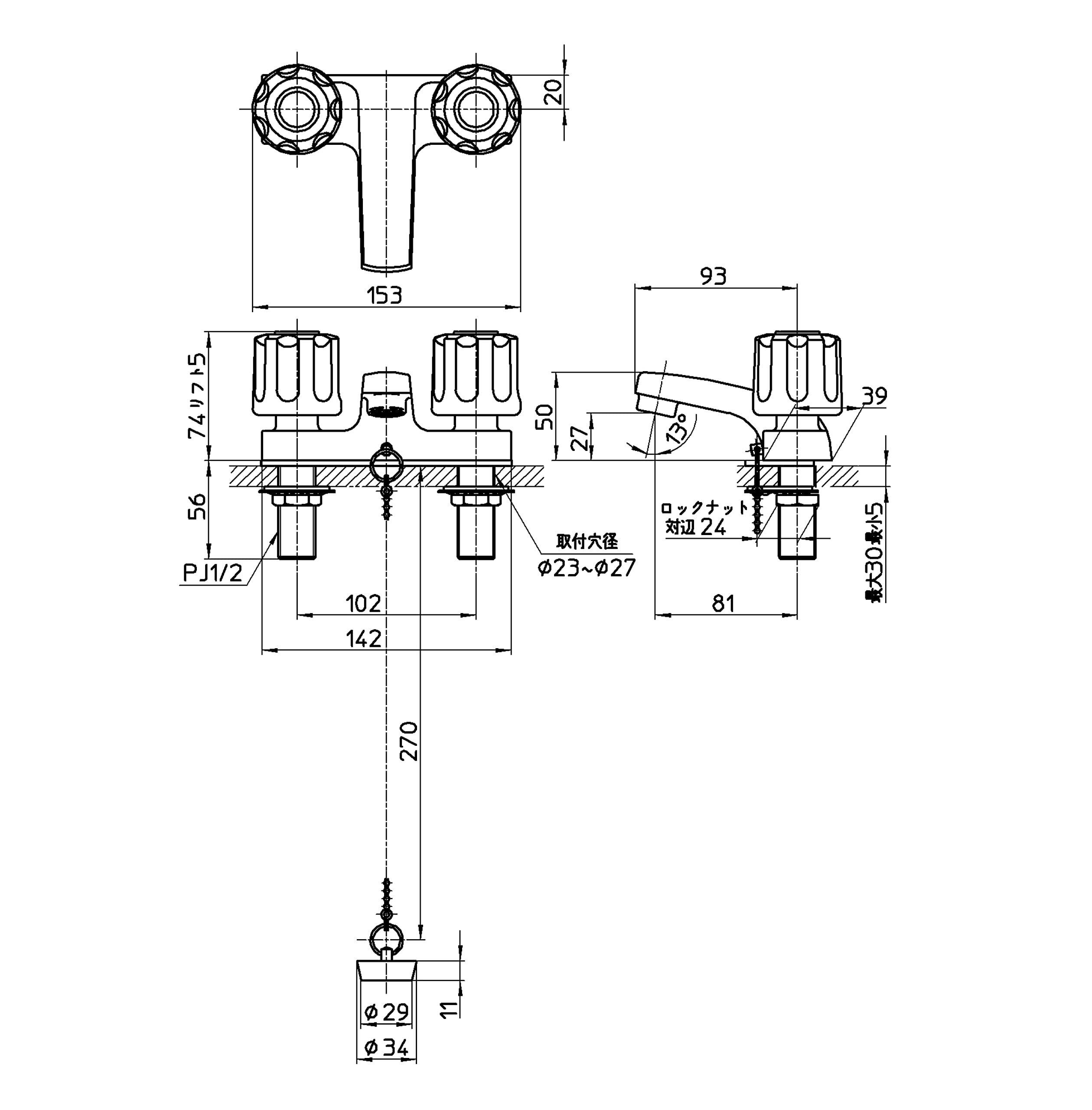ロックナット対辺:24mm 取付穴径:Φ23-27mm 吐水部長さ:93mm 取付幅:102mm クサリの長さ:270mm