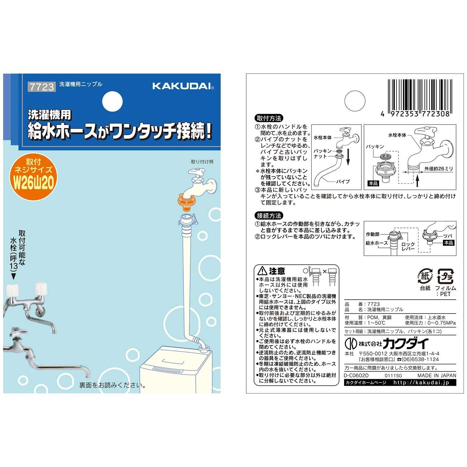 カクダイ 洗濯機用 取替簡単ニップル 呼13 自在水栓 対応 給水ホースをワンタッチ接続 樹脂製 7723