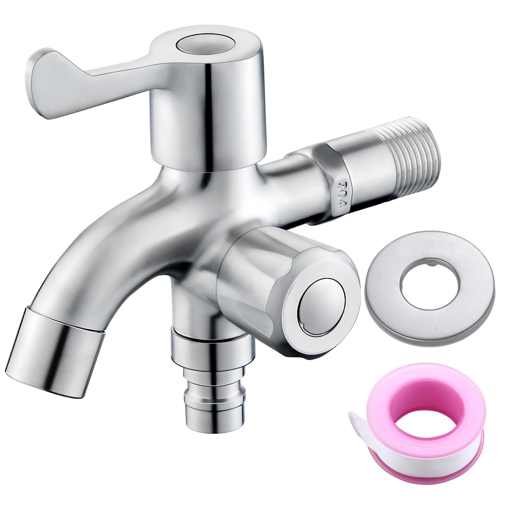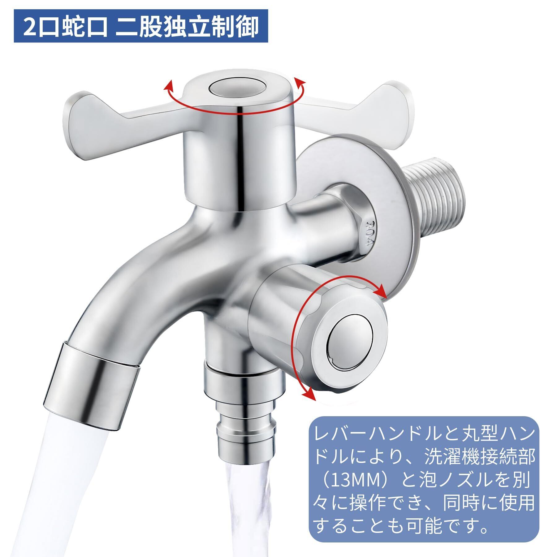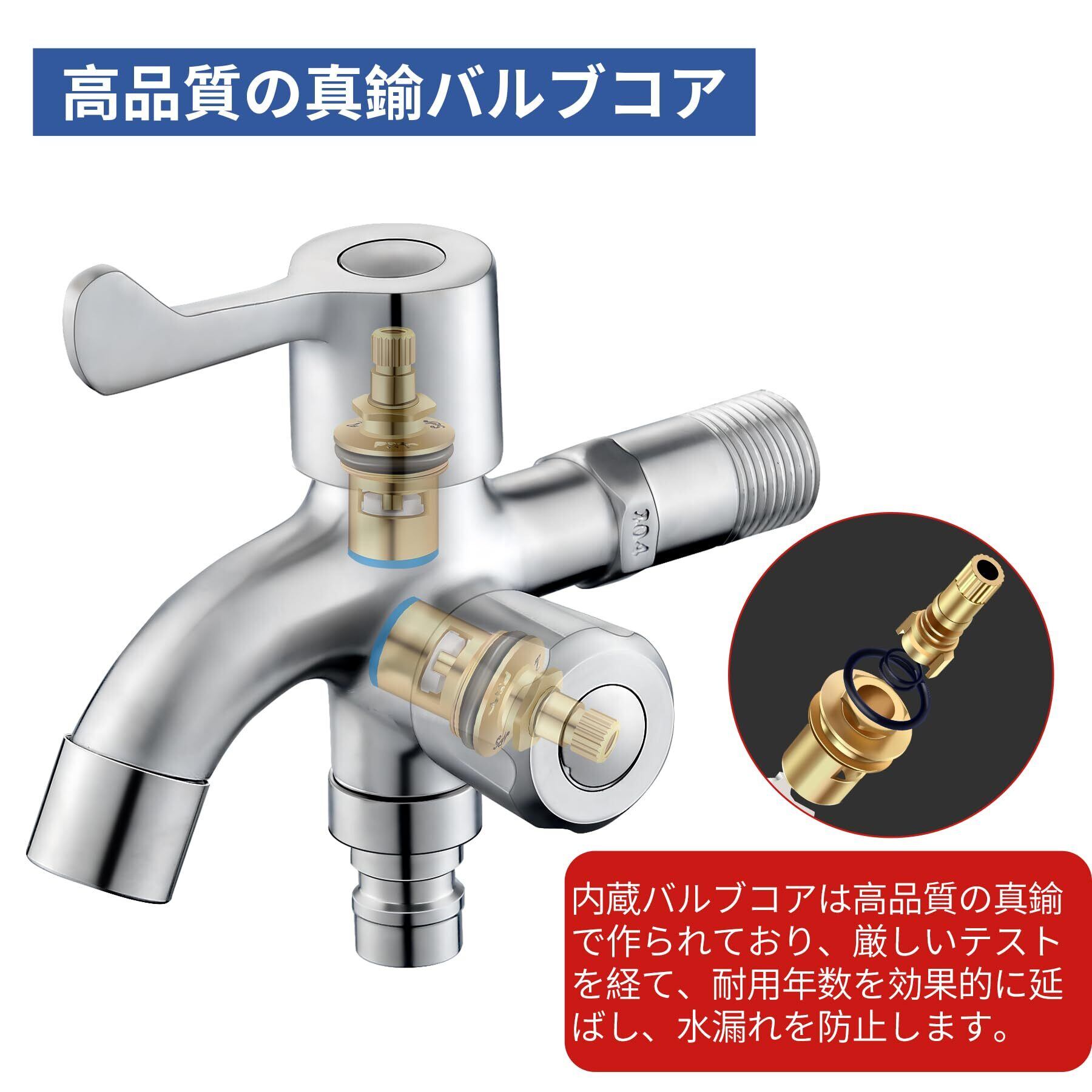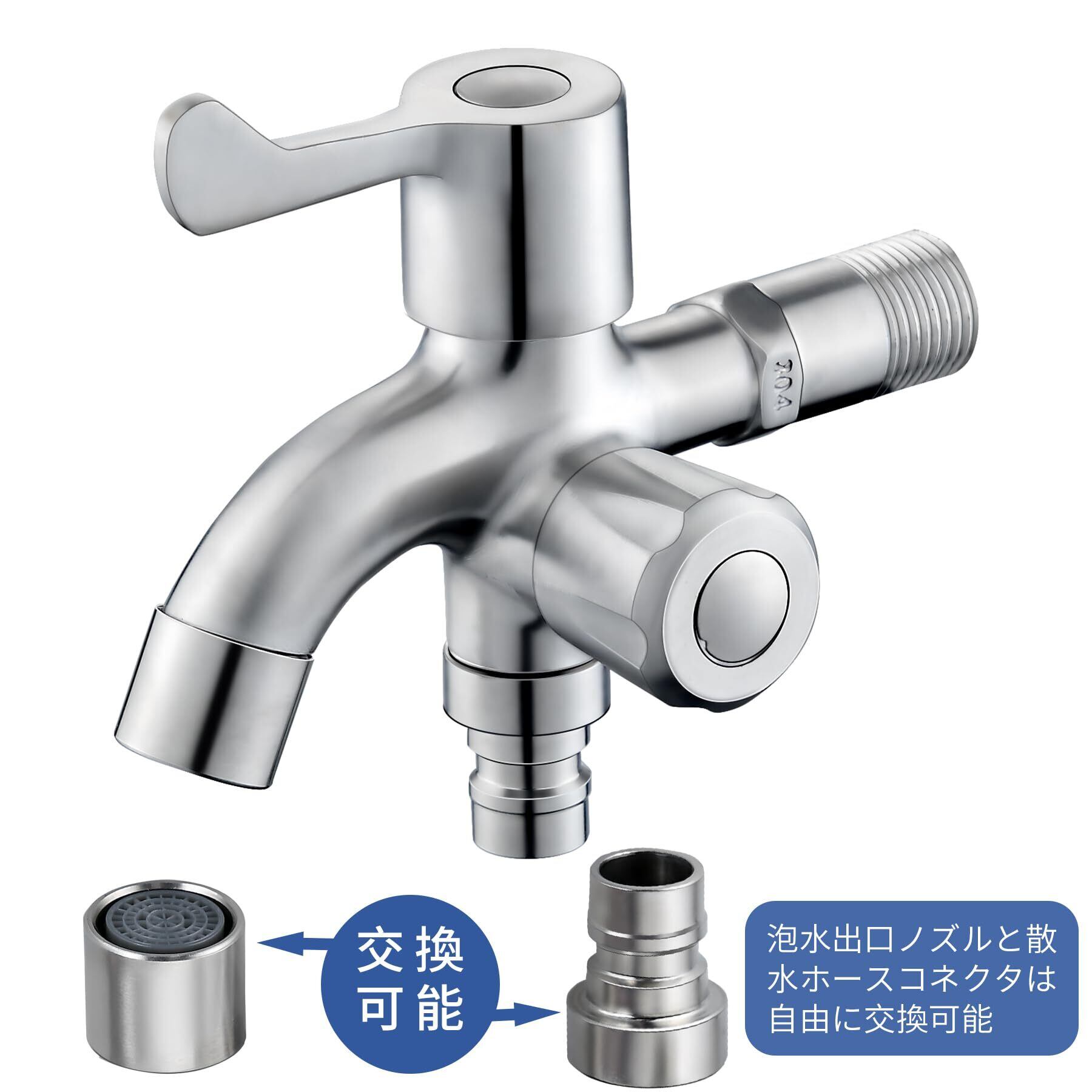 水道 蛇口 二股:屋外での使用のためのこの蛇口には2つの水分があります,洗濯機ホース接続ニップル付双口蛇口,2つの真鍮製バルブで独立制御される吐水口を搭載。1つは泡沫金具付きで手洗い用、もう1つは洗濯機ニップルを備え、洗濯機ホースとの接続に最適化された設計です。