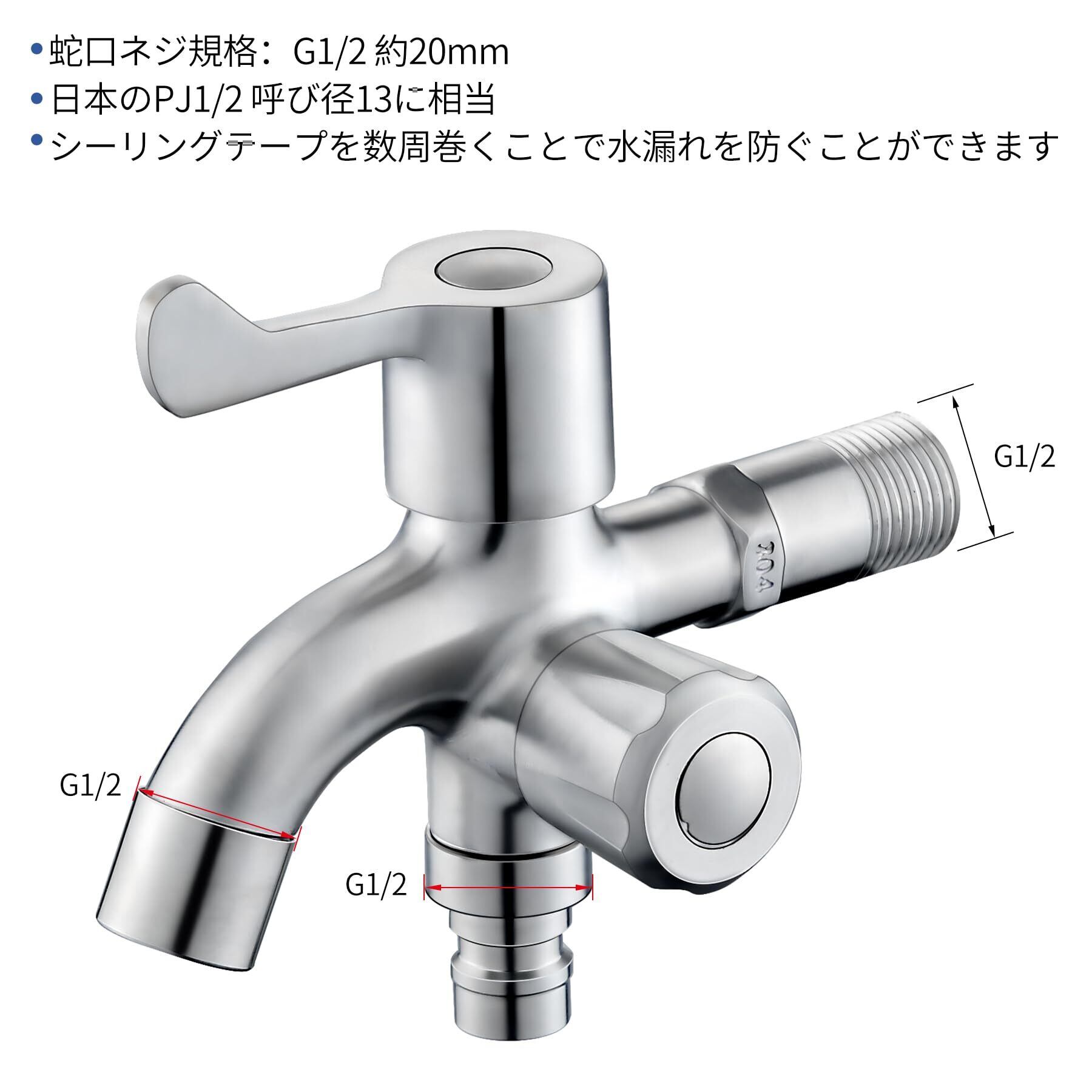 取り付け簡単:5mシールテープ付き,簡単にインストールできます,この外水栓蛇口二口は壁付け設置が可能。ねじ接続規格は国際基準G1/2、取付穴径約20mm,日本規格PJ1/2/呼び13に相当。既存のパイプとの互換接続を実現。漏水防止のコツ!取り付け前にシールテープを蛇口のねじ部分に約10回巻き付けます,全周にわたり均一な厚みを確保。