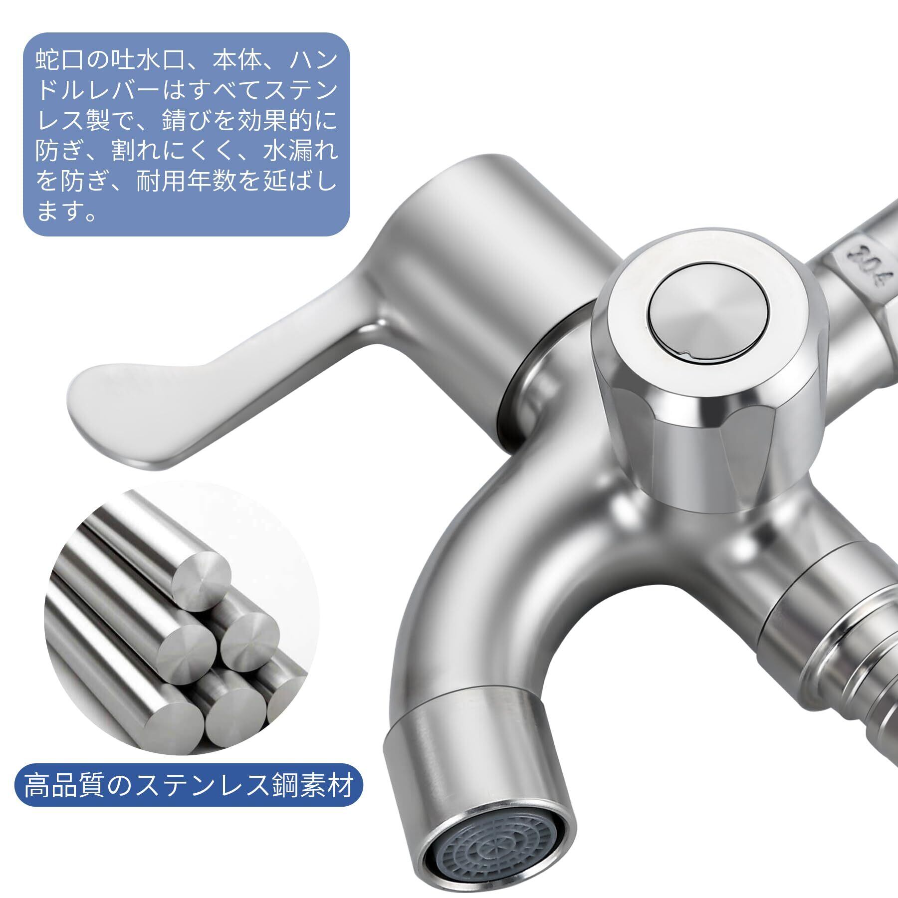 表面処理防錆:この水道蛇口2口表面はステンレスブラシ加工を採用し、銀色マット質感を実現。ご注意,沿岸地域の屋外で蛇口をご使用の場合、雨水中の微量な酸性成分による影響で表面に軽い錆跡が生じることがありますが、これは正常現象です。研磨剤不使用の中性洗剤を柔らかい布に含ませ、軽く拭くことで表面の汚れを除去できます。