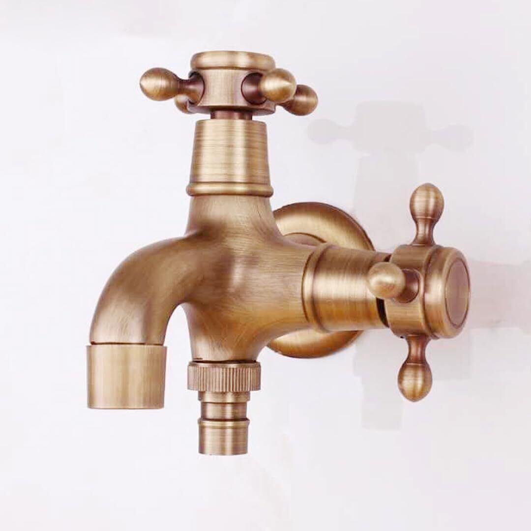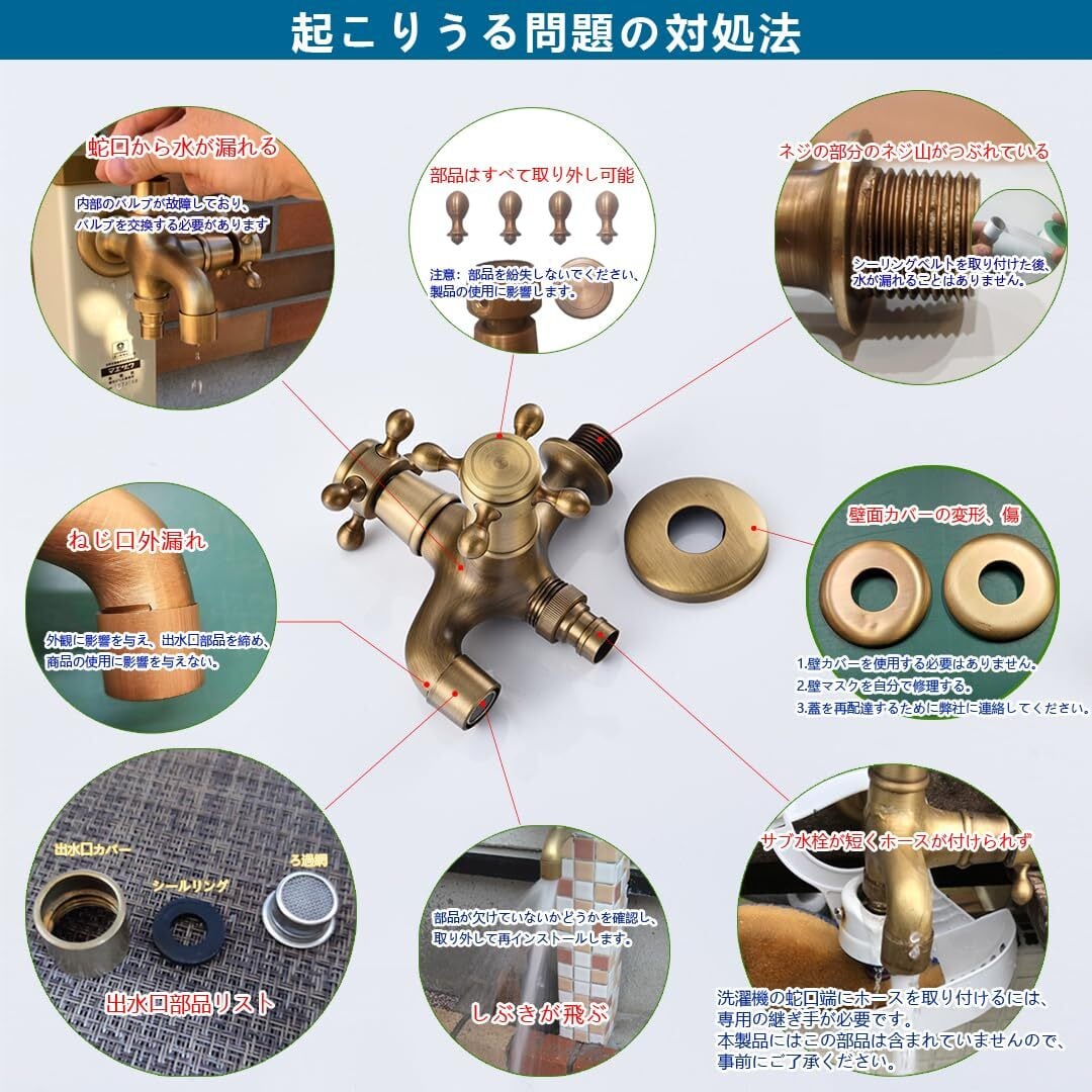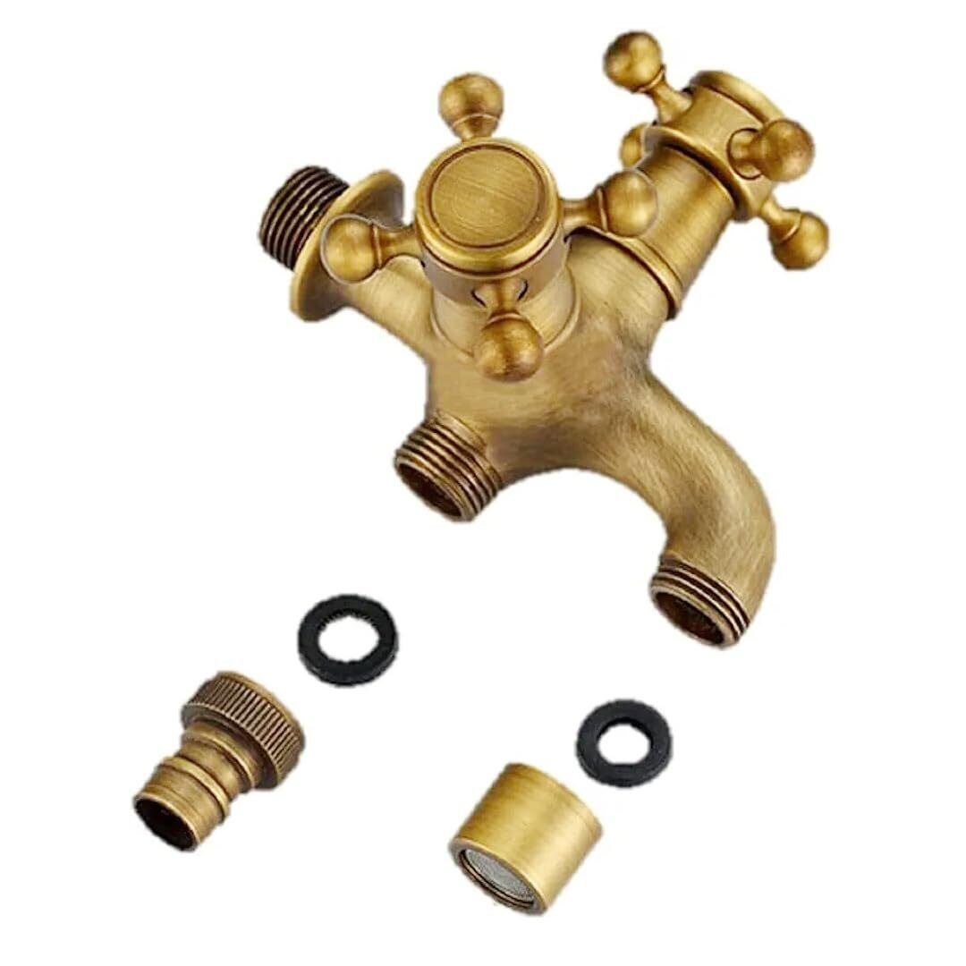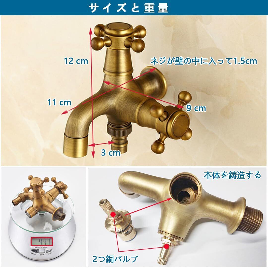 【双口水栓仕様】材質:真鍮です。表面処理:古ぼけた レトロ 感。タイプ:2口水栓。マックス旋回角度:1/4回転。インレットアウトレットネジサイズ:G1 / 2。適切なホースサイズ:G1 / 2。銅の原色の外観は、とても独特で、多くの人はその優雅な外観に惹かれます。