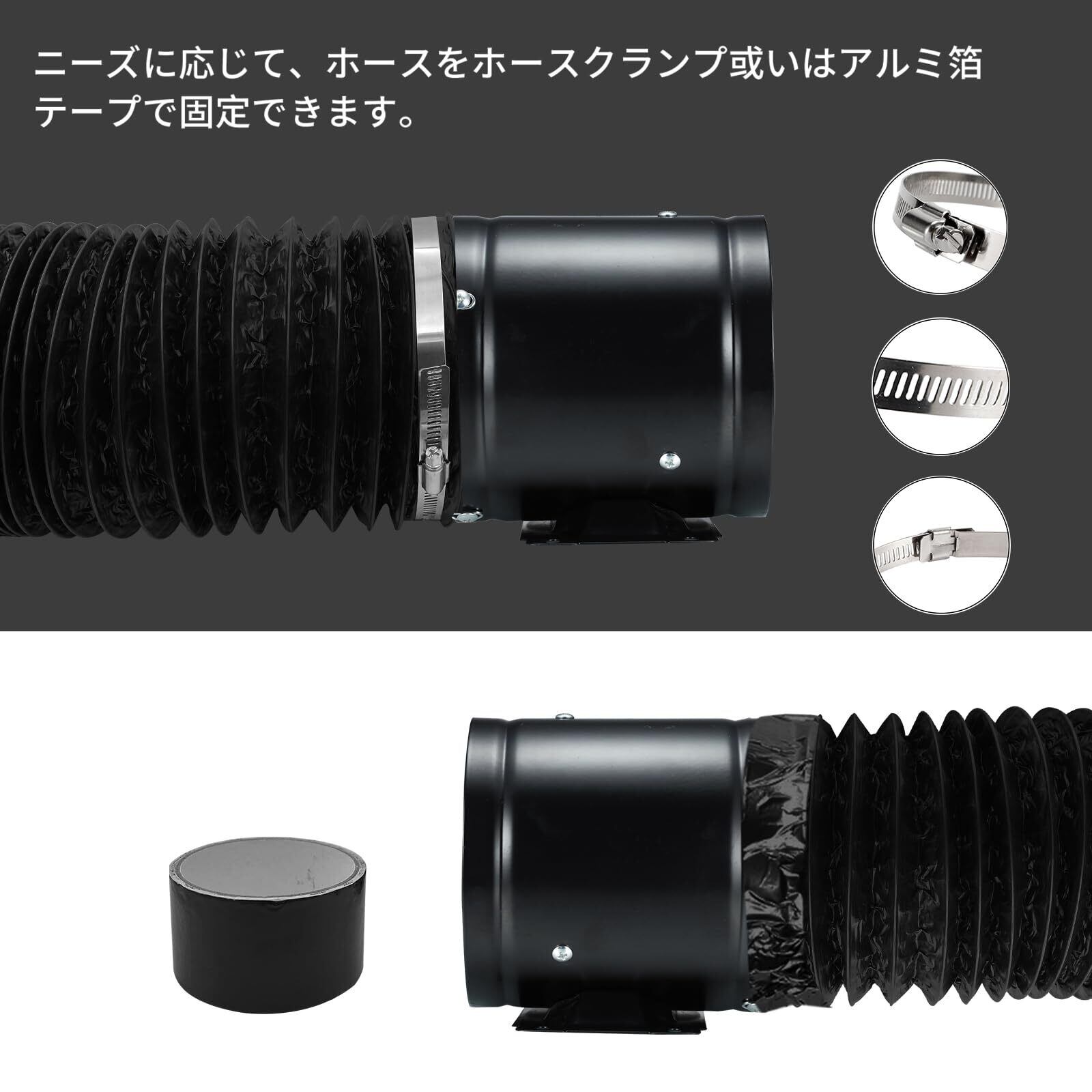 家庭用工業換気扇・取り付け簡単:この換気扇には取り付けベースが付属しており、窓辺に直接置いて使用することもでき、付属のダクトホースに接続して油煙や排気ガスを屋外に排出し、室内環境を改善することもできます。セットには換気扇*1、2mダクトホース*1、ホースクリップ*2とアルミ箔テープ*1などがあり、取り付けに必要な部品を満たしています。適切な部品選びに悩む必要はありません。