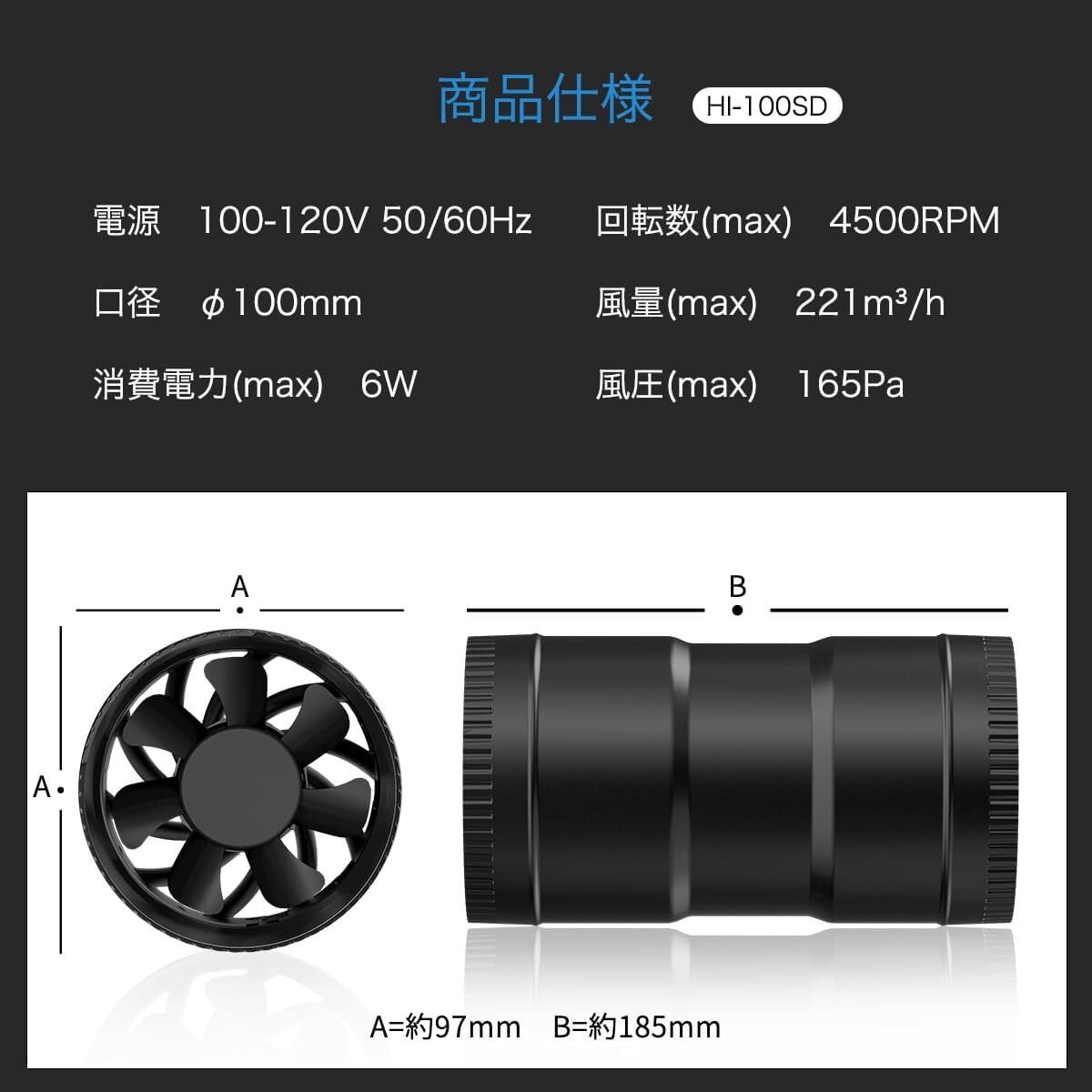 Hon&Guan ダクトファン 100mm 中間取付型【インボイス制度登録店】換気扇 パイプファン 排気 強力 省エネ 静音 ダクト用/窓用/卓上用/塗装ブース用/家焼肉 丸形タイプ 産業用換気扇 取扱説明書付(HI-100SD/φ100mm,単品) | KSショップ
