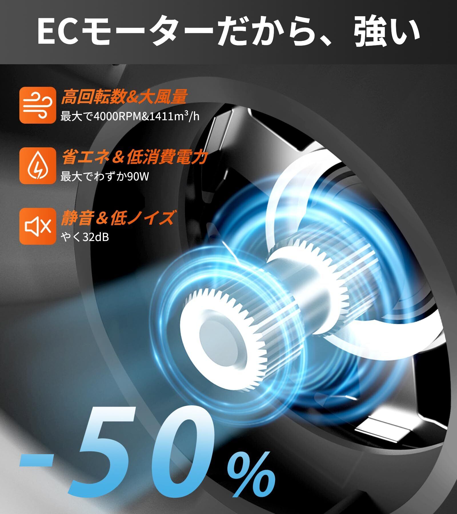 【小さな体なのになかなかのパワーがある】当社最先端のECモーターを搭載し、今まであまり見えないサイクロンテクノロジーの技術を採用されました。吸入側から空気を吸い込み、まるで掃除機が吸い込むような、空気を円錐形の「コーン」内で高速回転させます。従来品のACモーターなどと比べては、画期的に優れた性能があり、低消費電力、低ノイズ、高静圧(遠距離送風)が特徴です。