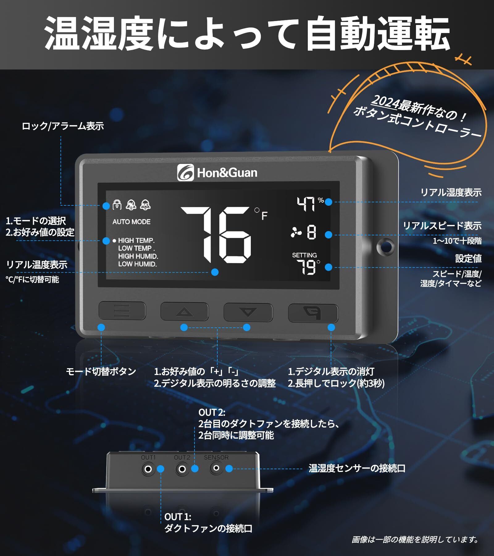【コントローラーについてより詳しいご説明】簡単に言えれば、三つのモードがあります。1.固定風量段階で運転/2.自動モードで周囲の温湿度にて運転/3.タイマーで運転です。1の場合、温度また湿度にも関わらず、設定した段階で運転し続けます。2の場合、ご希望の最大と最小の温度と湿度値の設定が必要です。設定したらセンサー値によって自動運転します。3の場合、設定したタイマー値で運転し、時間になったら自動にオフします。以外、アラーム値の設定も可能です⇨この値になったらコントローラーから鳴り声がします。