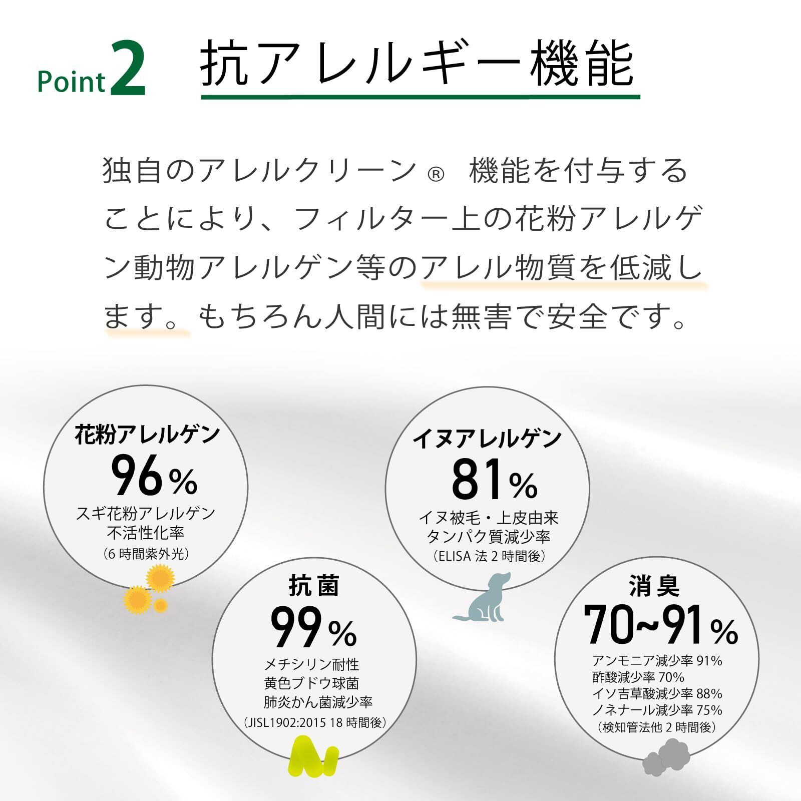 【抗アレルギー機能】独自のアレルクリーン機能を付与。フィルター上の様々なアレルゲンを低減します。