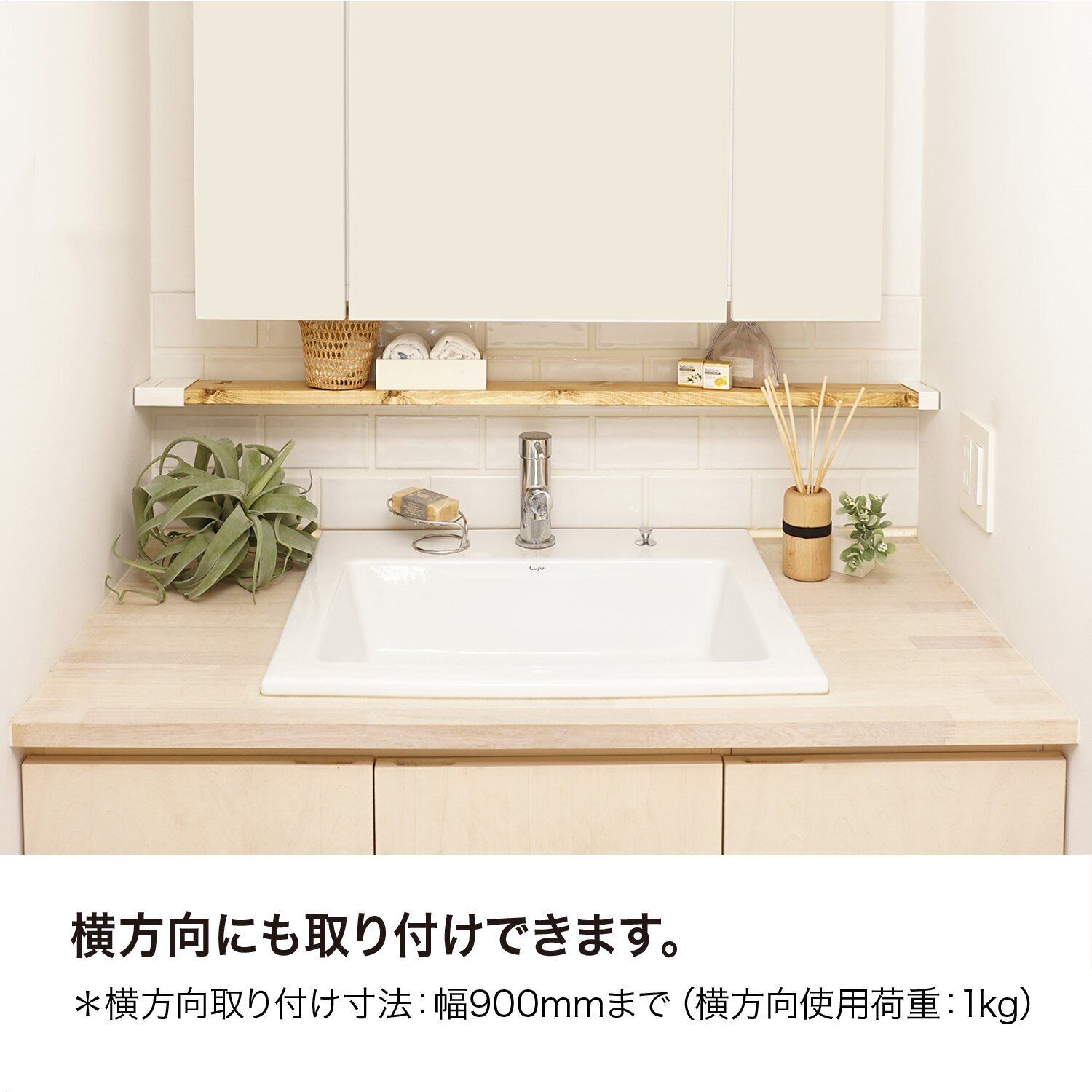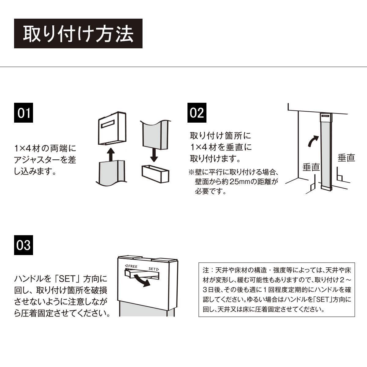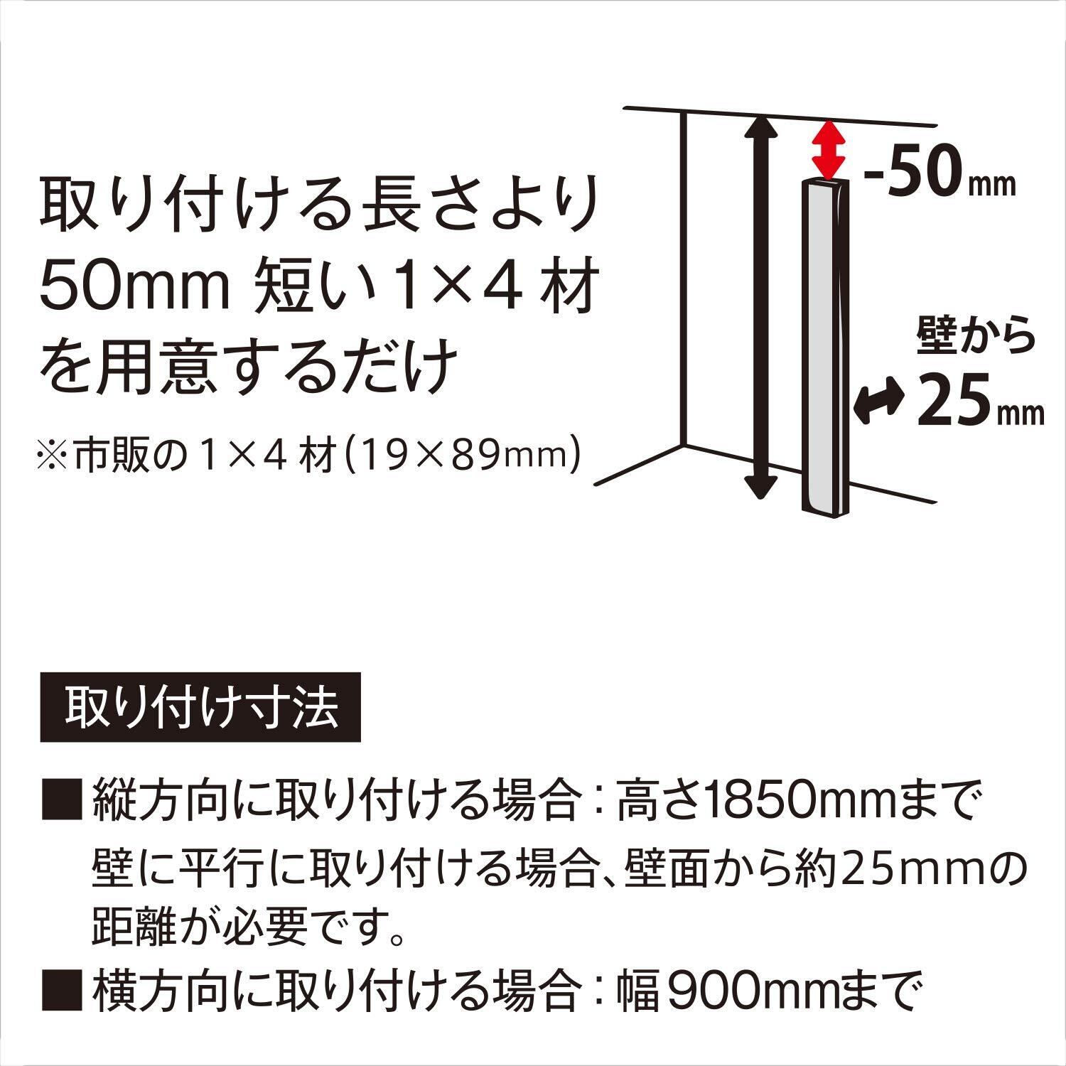 【対応木材】1×4 木材 【取付寸法】〔縦取り付けの場合〕高さ1850mmまで 〔横取り付けの場合〕幅900mmまで【木材カットの目安】取付場所の長さより50mm短い木材をご用意ください。