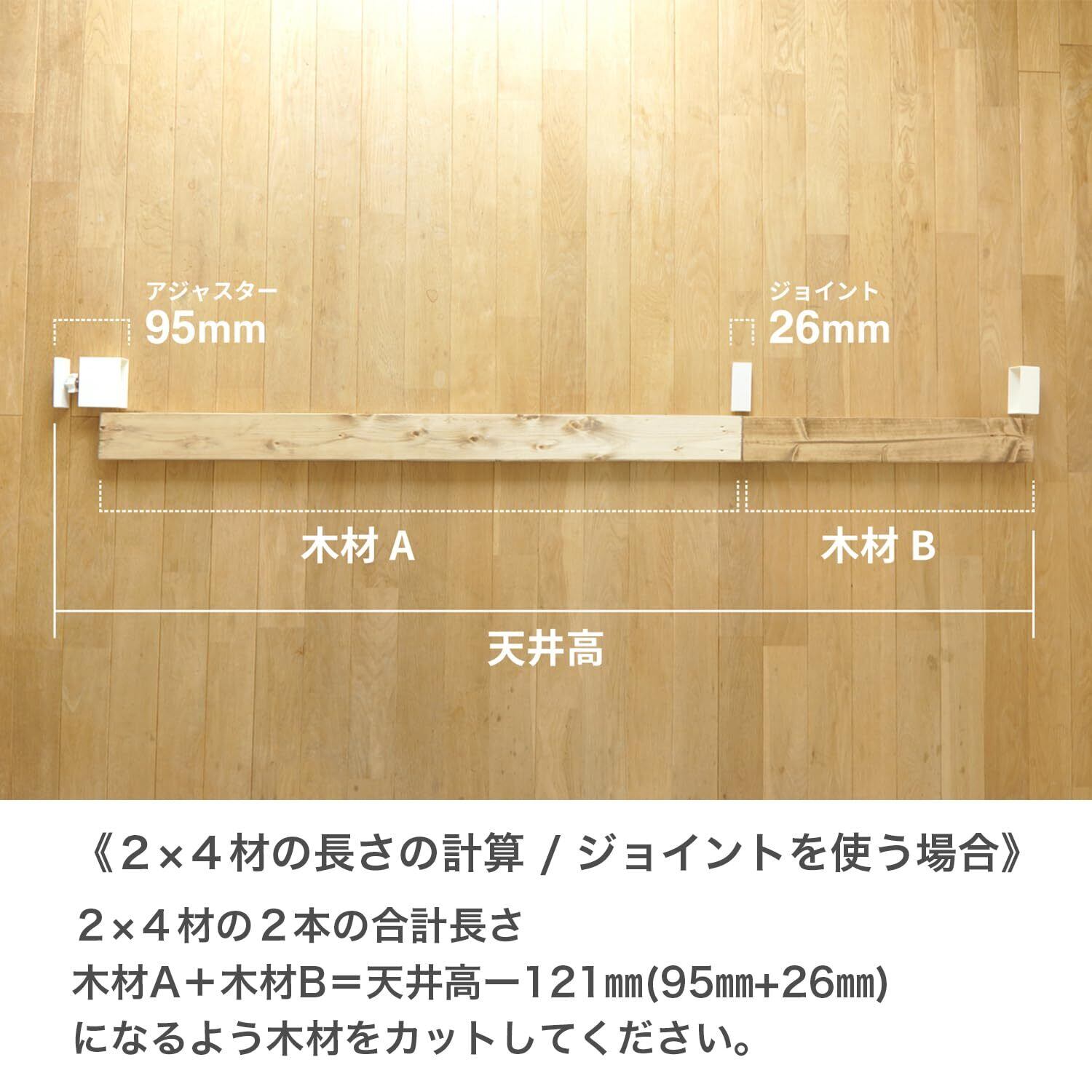 ・この商品は市販の 2×4材(38×89mm)を使った突っ張り商品「2×4 アジャスター」の木材の長さが足りない場合に木材を接合するパーツです。