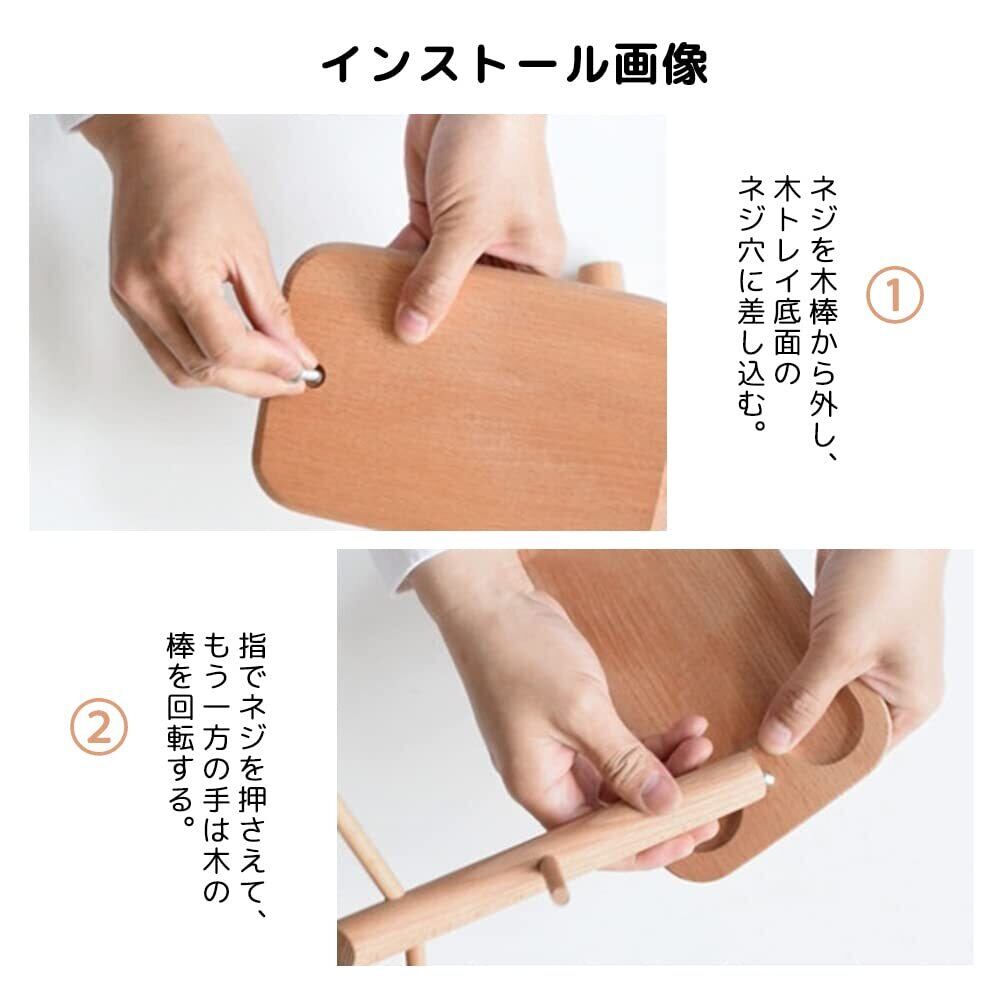 ●インストール:方法①1.ネジを木棒から外し、木トレイ底面のネジ穴に差し込む。2回転する時指でネジを押さえて、もう一方の手は木の棒を回転する。(もし締め付けていない場合は、ドライバーで締付ける)。方法②手で木棒を握って、直接トレイ底面のネジ穴に合わせて回転して締付ける。