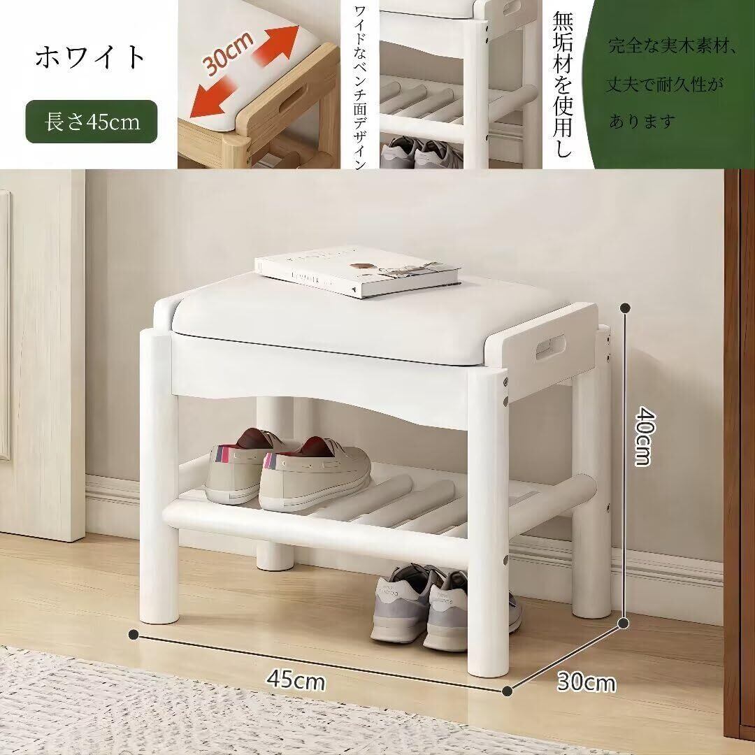 PANCY 玄関ベンチ 木製 無垢材 北欧 幅45cm 天然木 シューズラック 収納ベンチ 玄関椅子 玄関スツール シューズボックス 靴収納 雑貨 家具 (ホワイト、45x30x40cm)