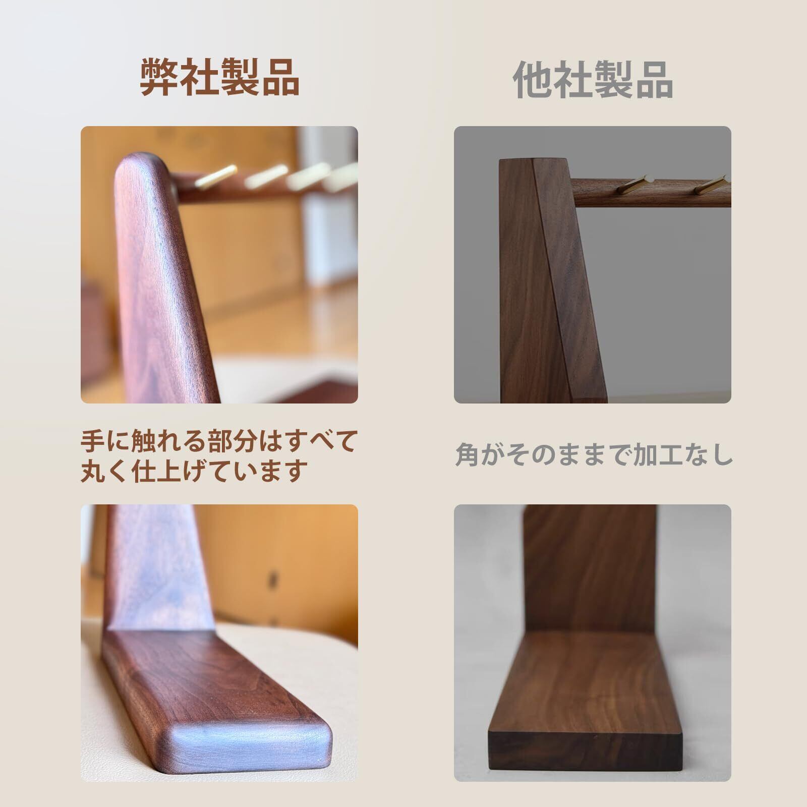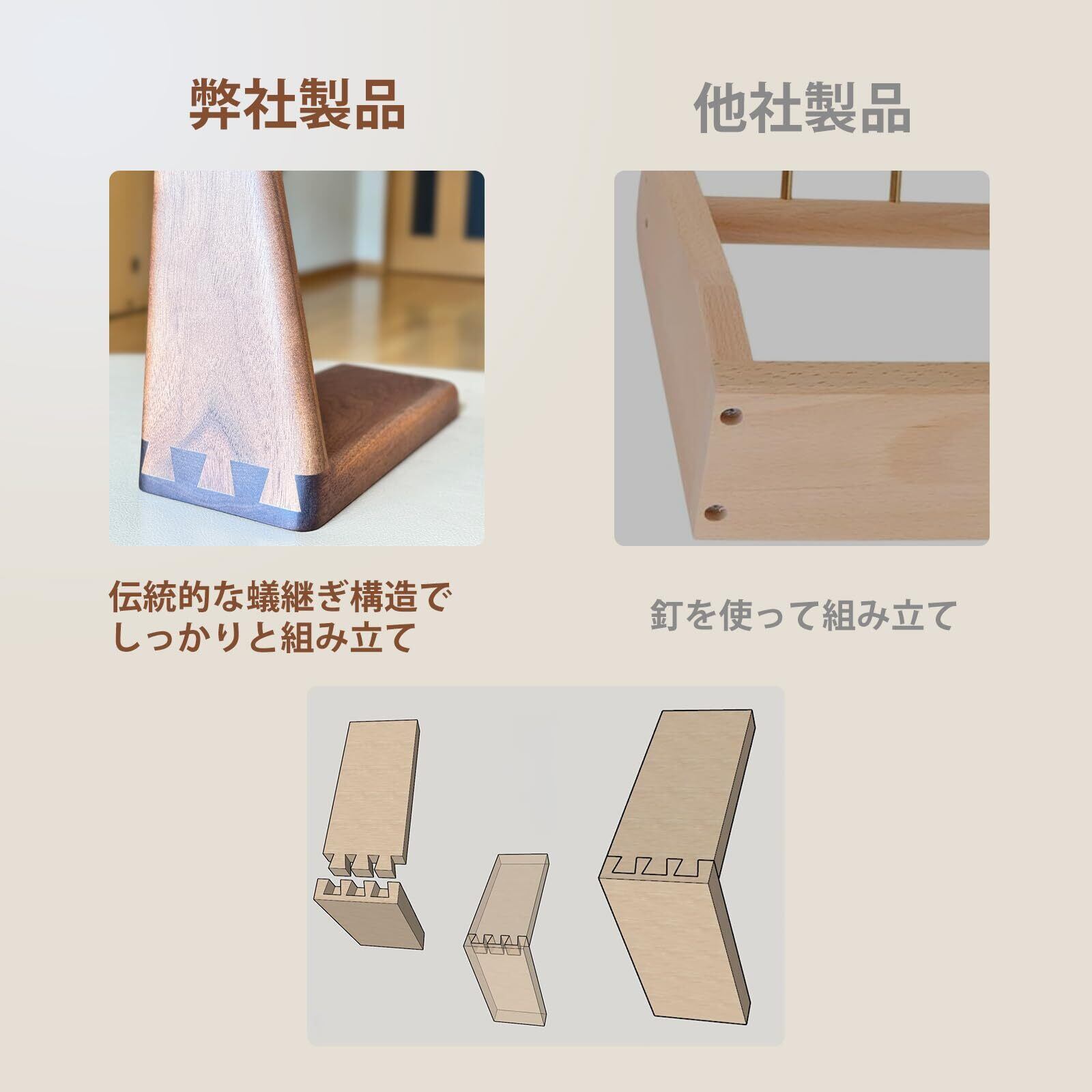 【伝統の技・蟻継ぎ構造】釘を一本も使わず、伝統的な蟻継ぎ(ありつぎ)構造でしっかりと組み上げられており、丈夫で長く使えるつくりです。無垢の真鍮棒は丁寧に埋め込まれており、先端がわずかに上向きになっているため、鍵などが滑り落ちにくい安心設計です。