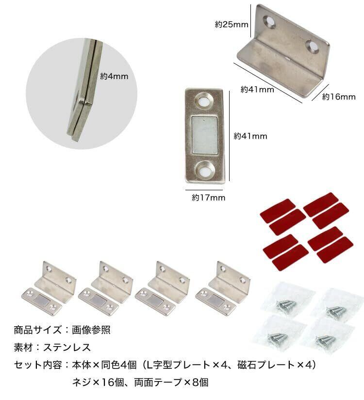 prendre L字型 マグネットキャッチ 4個セット 磁気キャッチ ステンレス 薄型 強力 ドア止め金具 家具扉 戸棚 ドアキャッチ DIY 引き戸 両面テープ ネジ (ブラック) PR-LMAG4-BK | KSショップ