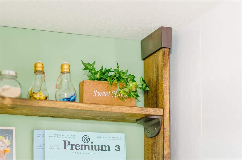 使用方法:壁を傷つけずに1×6材(断面サイズ約19mm×140mm)を突っ張り、棚などを作成できます。