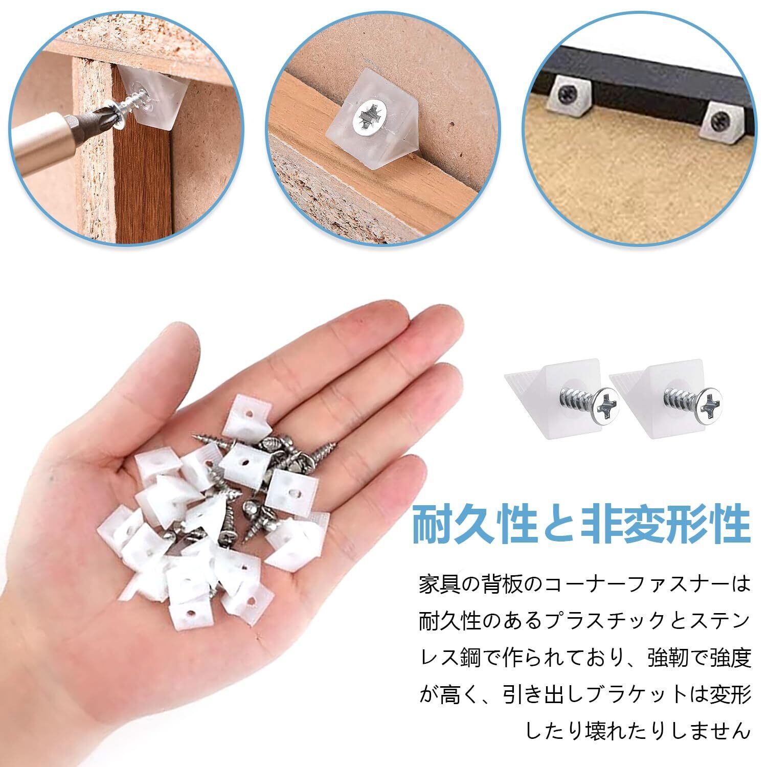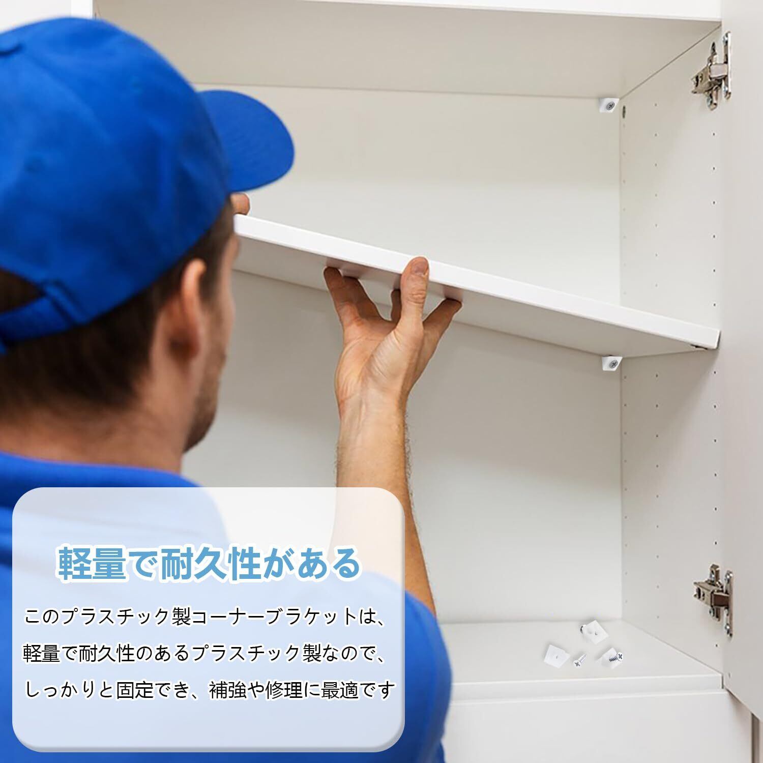 ◆数量:プラスチックアングルブラケット50個(ネジ付き) ◆本体サイズ:15×13×9mm ◆カラー: ホワイト ◆材質:プラスチック(アングルブラケット) ステンレス鋼(ネジ) プラスチック留め具の出っ張りを板の差し込み部分に挿入して、ネジをねじ込むだけ。外から見えない角度でネジがしっかり固定します。シンプルですが丈夫で長持ちします。また、指示書がなくても直感的に修理できます。50セットあるので、いろいろな場所を十分サポートすることが可能です。DIY初心者でもお手軽に使用可能なアイテムとなっております。