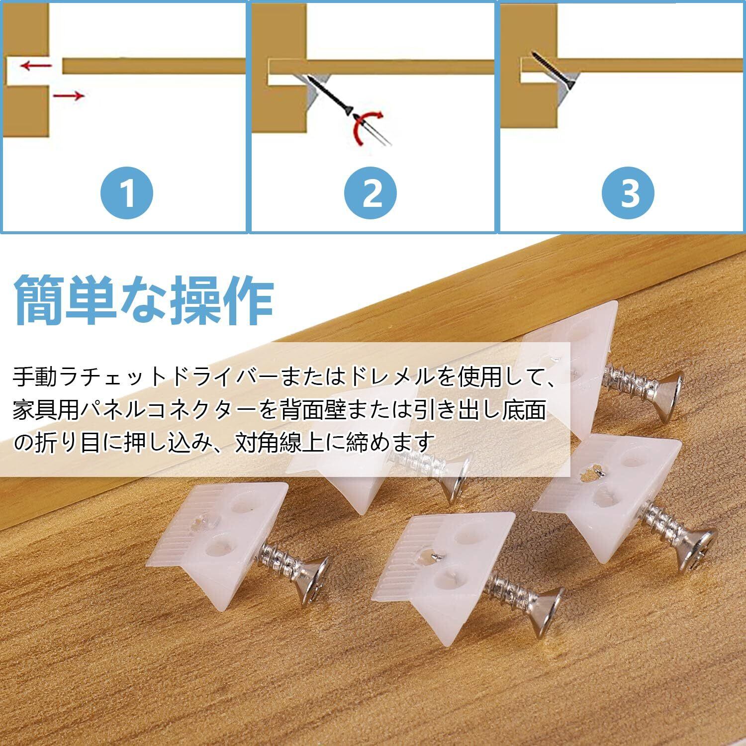【 取り付け方法 】プラスチック留め具の出っ張りを板の差し込み部分に挿入して、ネジをねじ込むだけ。外から見えない角度でネジがしっかり固定します。シンプルですが丈夫で長持ちします。また、指示書がなくても直感的に修理できます。50セットあるので、いろいろな場所を十分サポートすることが可能です。DIY初心者でもお手軽に使用可能なアイテムとなっております。