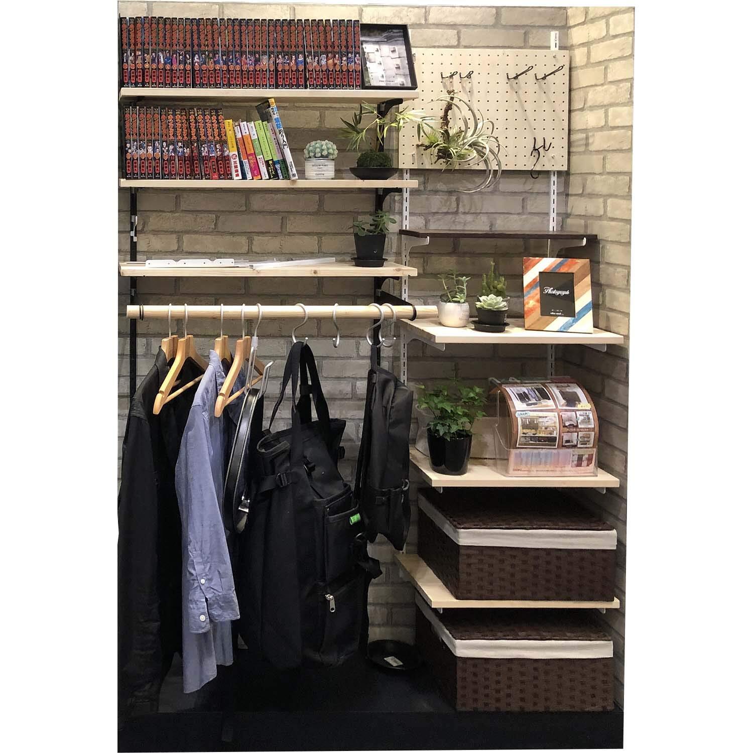 ピラシェル棚柱に有孔ボードや化粧板などを取付けできます。