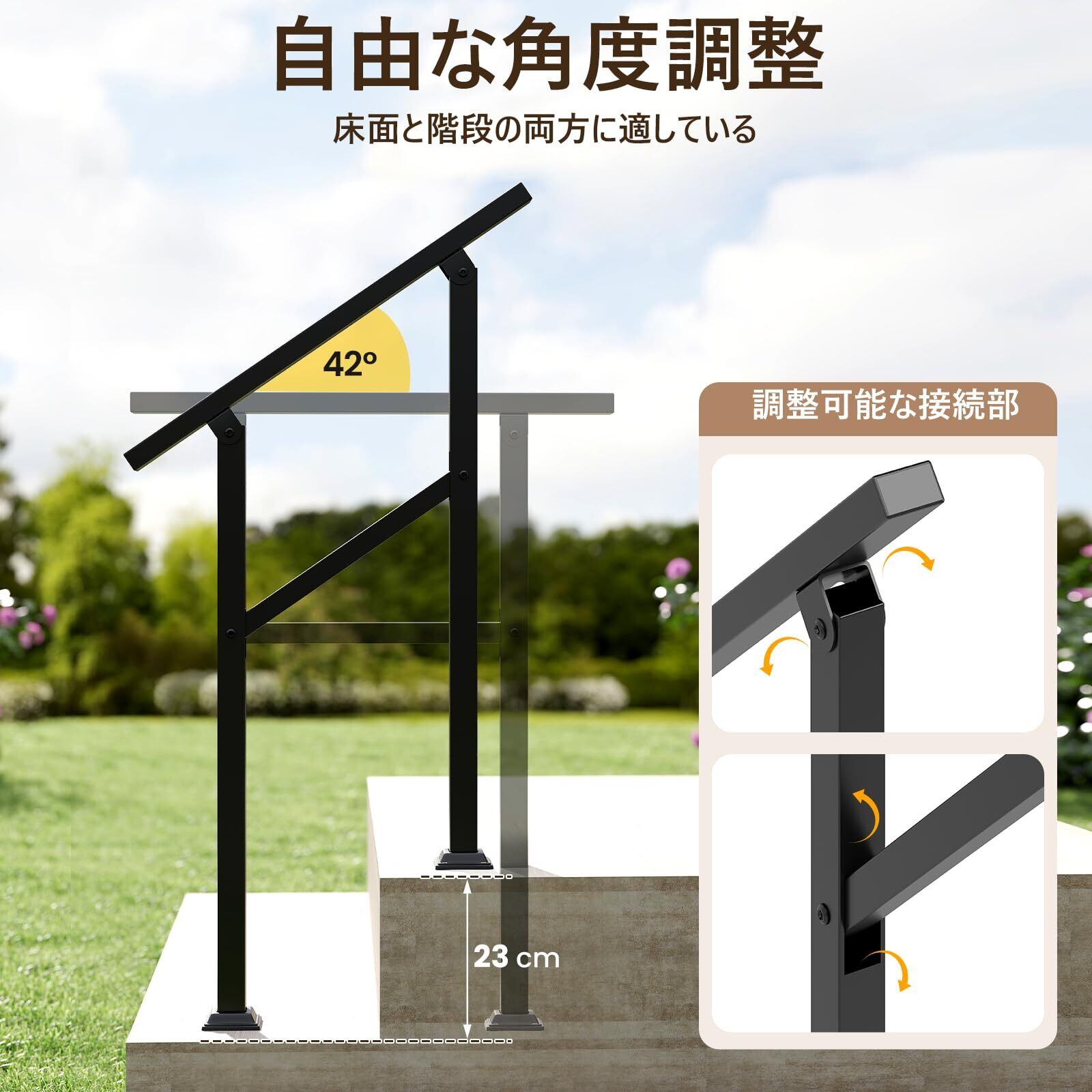 【柔軟な角度調整】42°の可変角度を備えたこの階段手すりは、平らな面だけでなく、0〜4段の階段にも対応します。購入前に階段の寸法を確認してください。