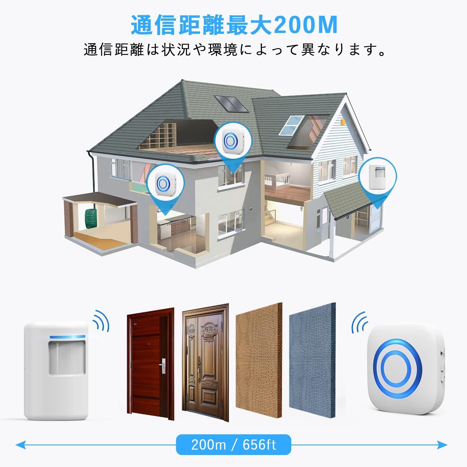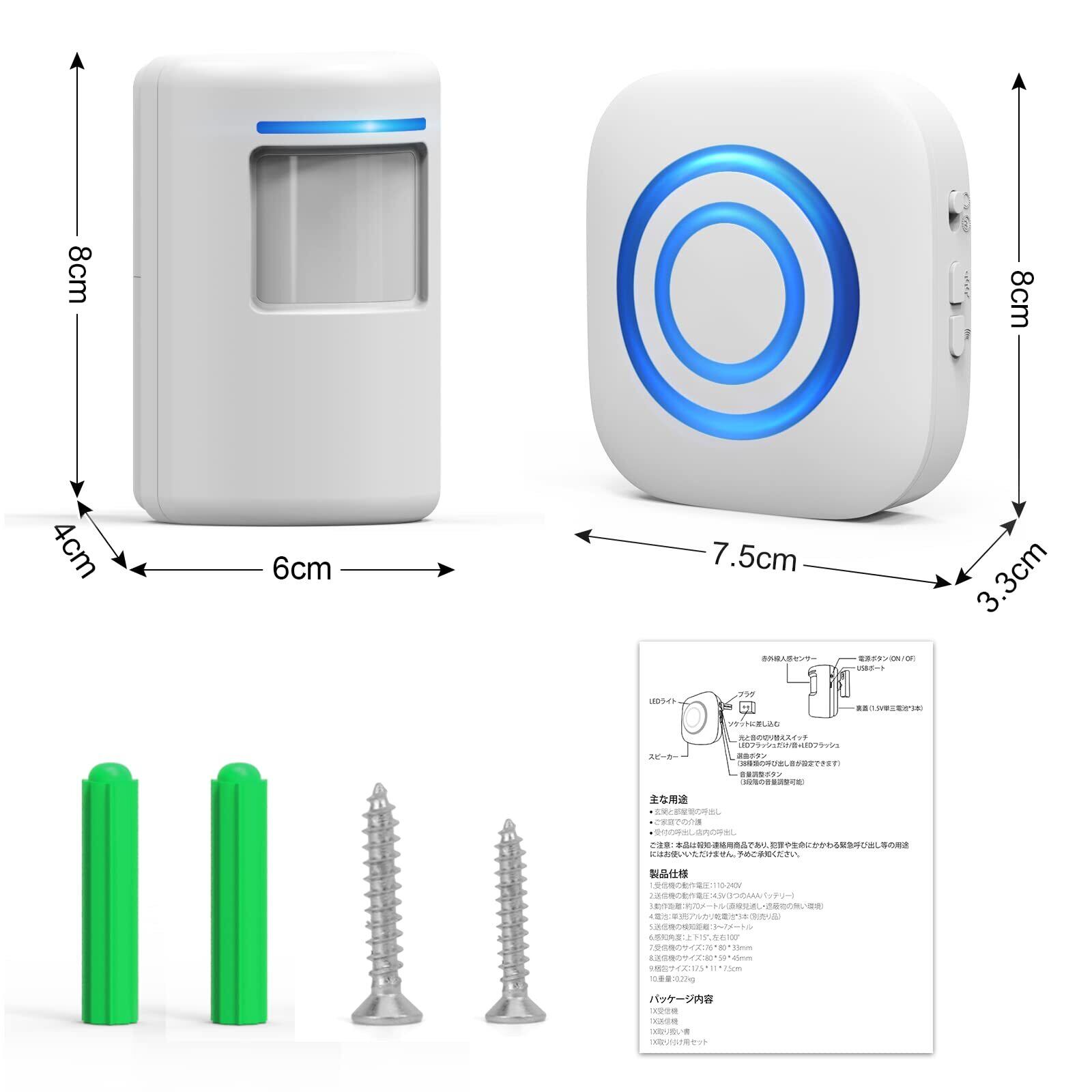 【受信機/送信機セット】●人感センサー送信機:来客などを正確に感知できる動体検知機能、感知距離は1.5-3mで、感知角度は上下15°で左右100°です。 回転すればセンサーの感知方向が自由に調整できます。●電池不要の受信チャイム(コンセントに差し込むだけ):離れた場所で青い光とチャイム音でお知らせ。受信機電波受信距離は屋外遮蔽物の無い状態で200m屋内で、見通しの良い場所で最大70m。