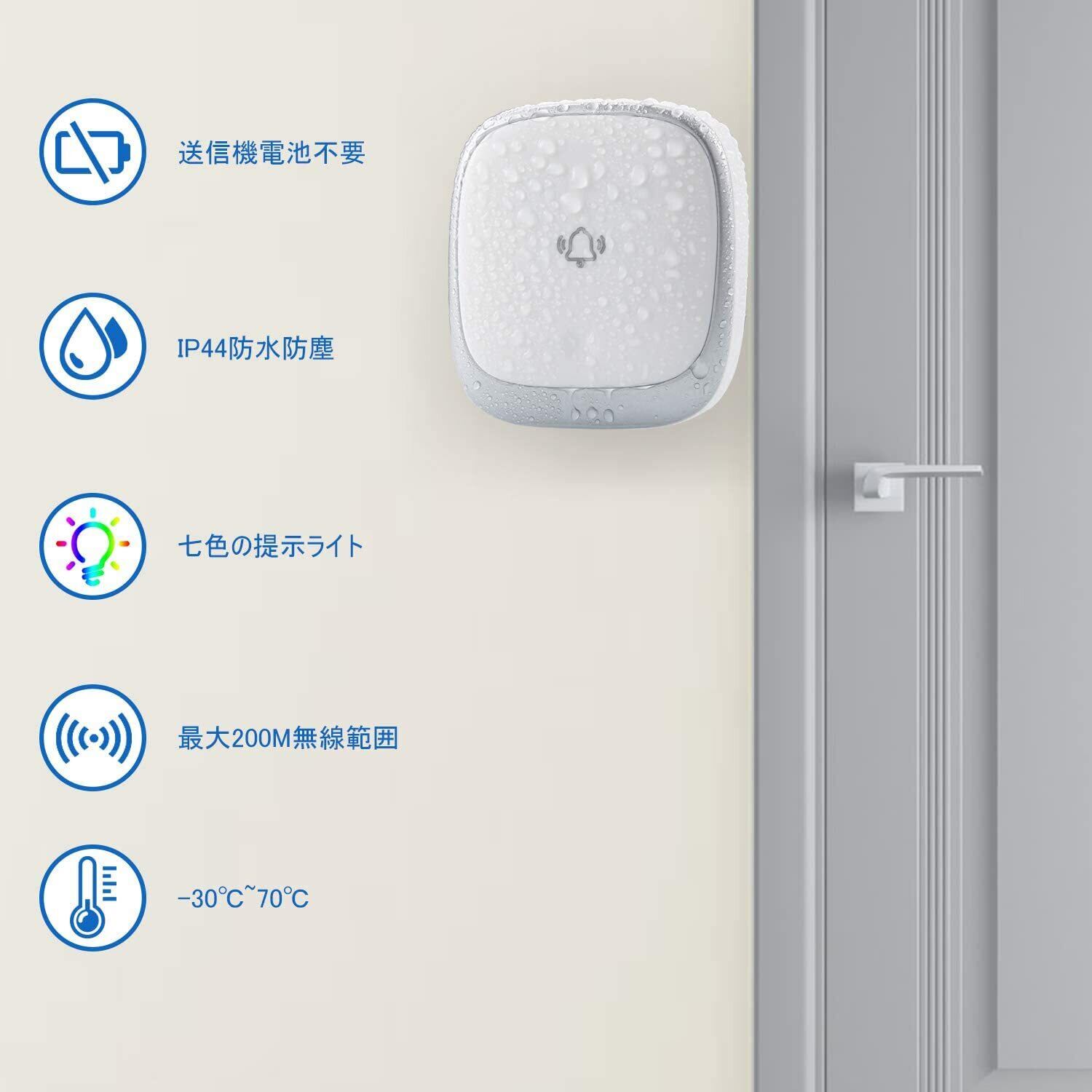 【防水防塵&電池不要の省エネデザイン】自動発電の発信機は電池不要で経済的かつ省エネです。呼び出しチャイムの押しボタン送信機はIP44防水仕様で優れた防水防塵性を持って、屋外や浴室でも楽にご利用いただきます。