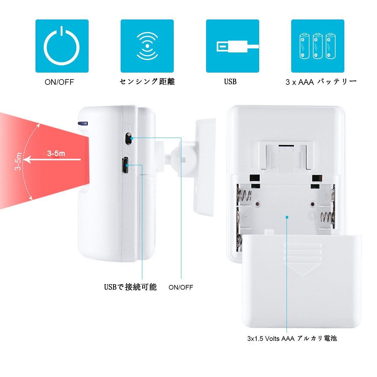 【ご了承ください】防水機能なし。正確なセンシングと受信のために、センターを傷つけないでください。工事なしでも設置できてしまうので、受信機がコンセントにいれて、送信機それぞれに電池を入れたら、お好きな場所に設置するだけでお使いいただけます。とても手軽で、お子供と年寄りの方も使用可能。