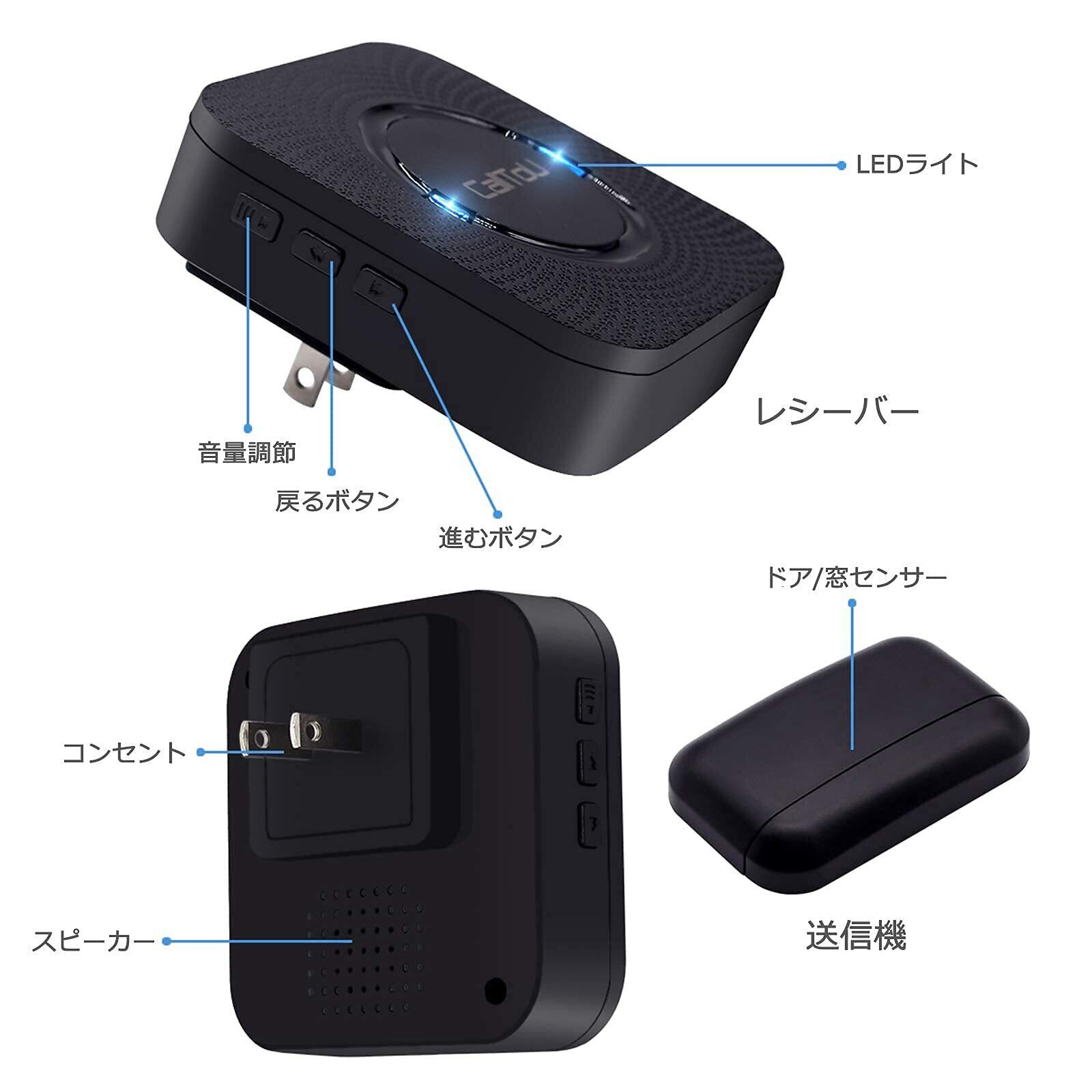 ▶【5段階音量調節でき&55曲選択可能】受信機の音楽音量は調整可能、音量調節5段階。(0-110db)、55種類の音楽が選択可能です & LEDカラー点滅ランプ。音量調節機能は夜間など近隣の迷惑を避けるために音を小さくしたりすることができます。