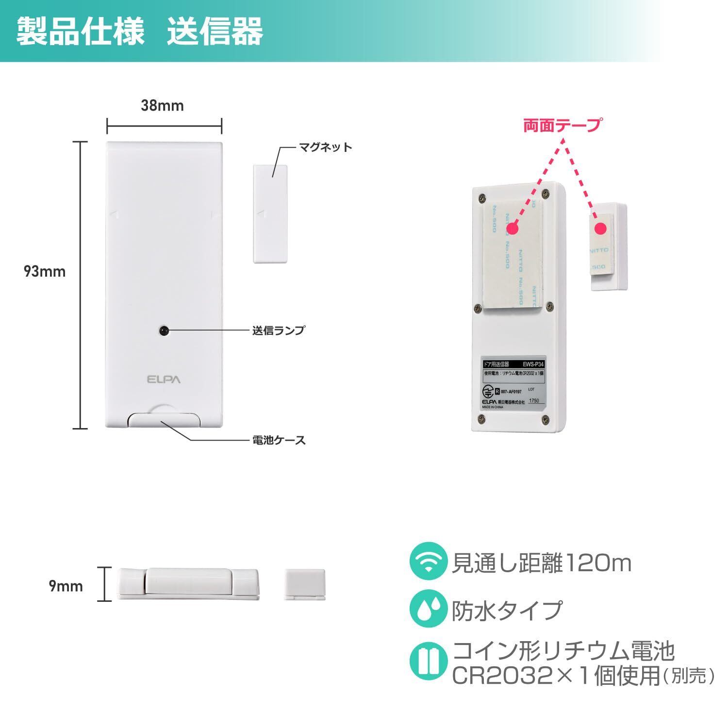 エルパ(ELPA) ワイヤレスチャイムドア開閉センサーセット 介護 オフィス 店舗 無線 配線不要 EWS-S5034