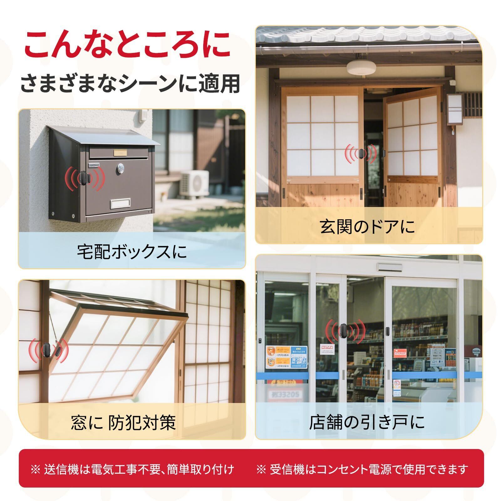 【無線チャイム ワイヤレスで介護サポート】ドアセンサー 開閉チャイム付きのワイヤレスチャイムは、ドアや窓の開閉センサーとして機能し、開くたびに受信機へ信号を送りドアチャイム 玄関として音で知らせます。冷蔵庫の開け忘れやドアベル 店舗用としての来客通知、さらに防犯チャイムとしての活用も可能。ドアベル 店舗用 引き戸にも対応し、店舗・ガレージ・マンション・在宅勤務などあらゆるシーンで大活躍します。