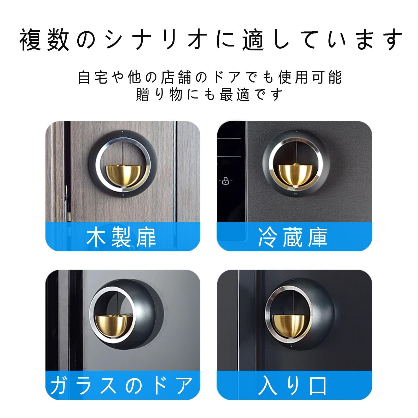 【幅広い用途】ドアベル 店舗用、玄関ドア、勝手口ドア、冷蔵庫のドアに取り付けられます。理髪店のドア、カフェ、雑貨店、その他の店のドアでも使用できます。 ドアを動かすとドアベルが鳴ります。そのため、特に子供やお年寄りがいる家庭や、お客様が来ることを注意する必要がある店舗での使用をおすすめします。誕生日、引っ越しのお祝い、結婚式、クリスマス、母の日、父の日、周年記念日、その他の場面での最高のプレゼントです。