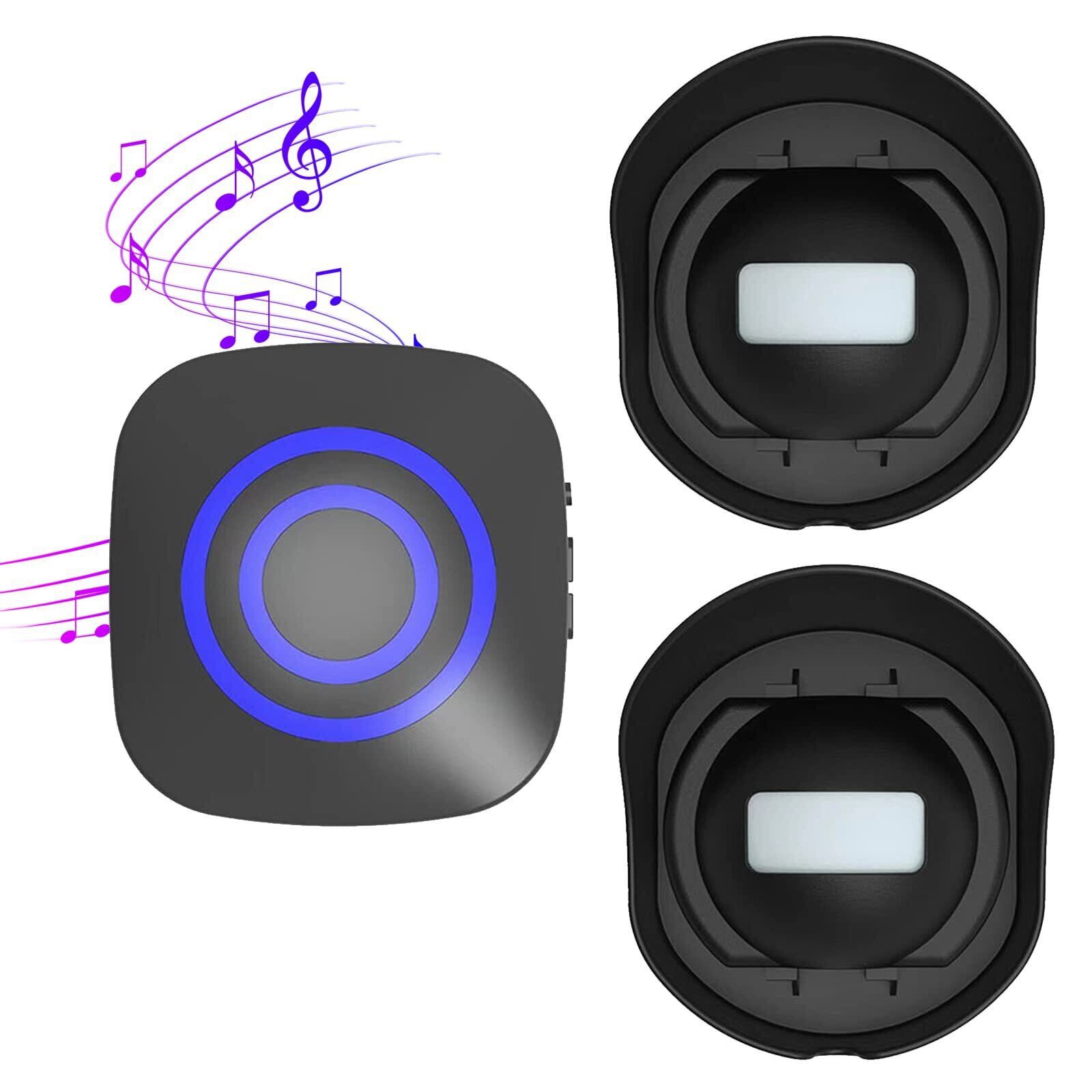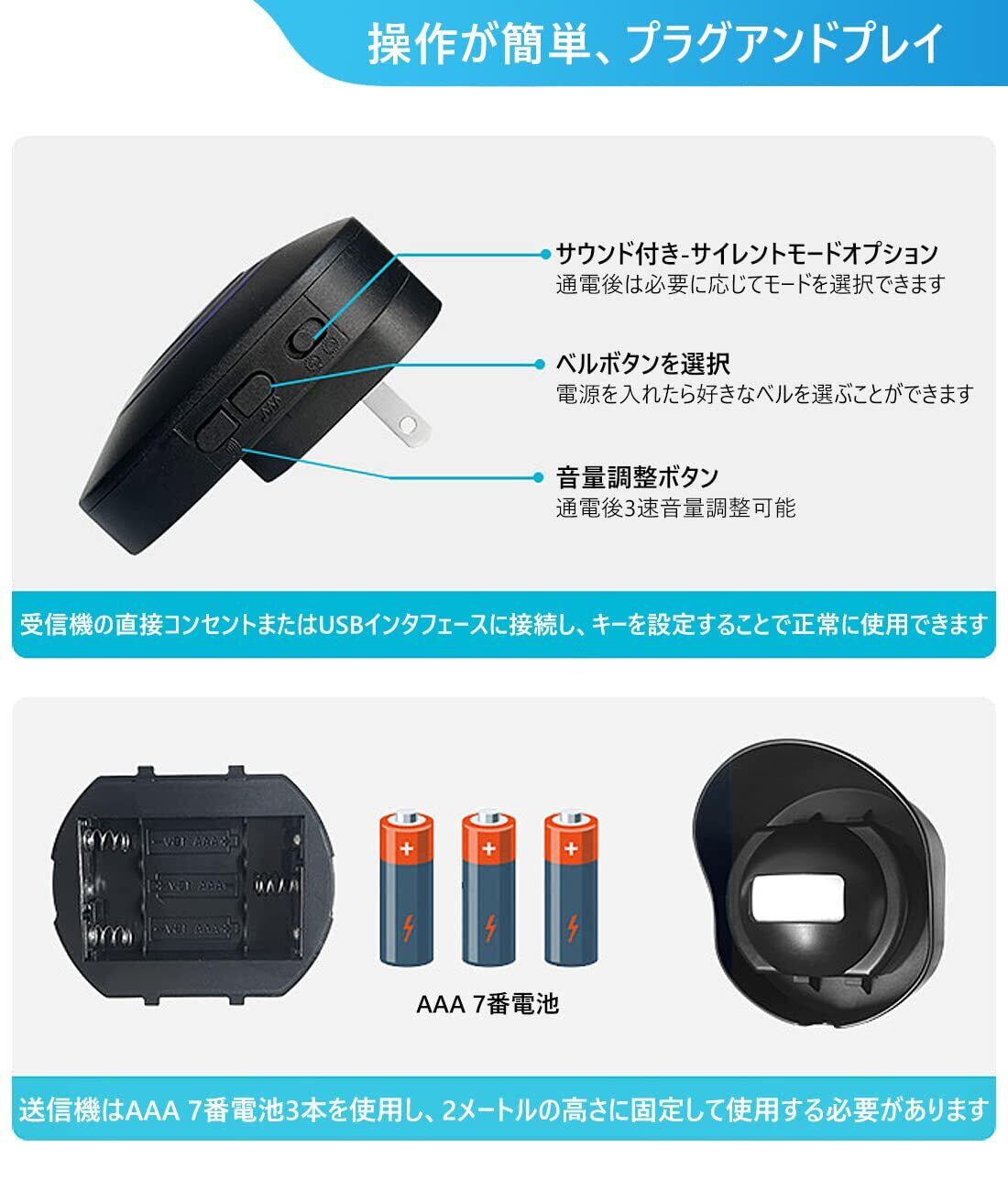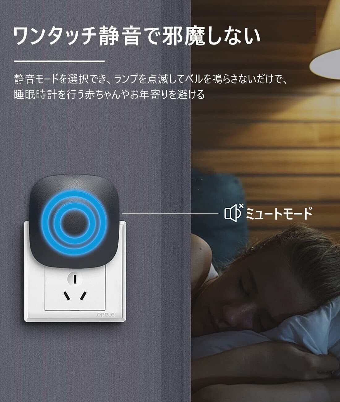 【38曲、音量調整】このワイヤレスチャイムは 38曲があり、3つのレベル(高、中、低)の音量調整、側面ボタンのタッチから調整可能です。LED指示灯と音の有無にかかわらず設定可能(サウンド:サウンド+インジケーターサイレント:インジケーター)。