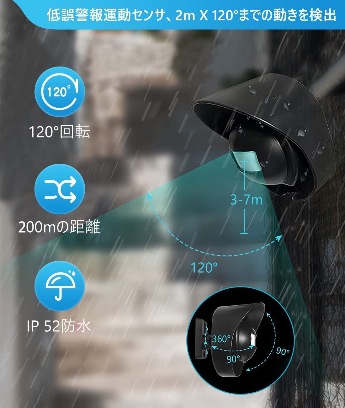 【無線範囲&赤外線センサー】感知距離は3~7mで、感知角度は120°です。受信機電波受信距離は遮蔽物の無い状態で200m。ドア越しにも信号が受信機できます。