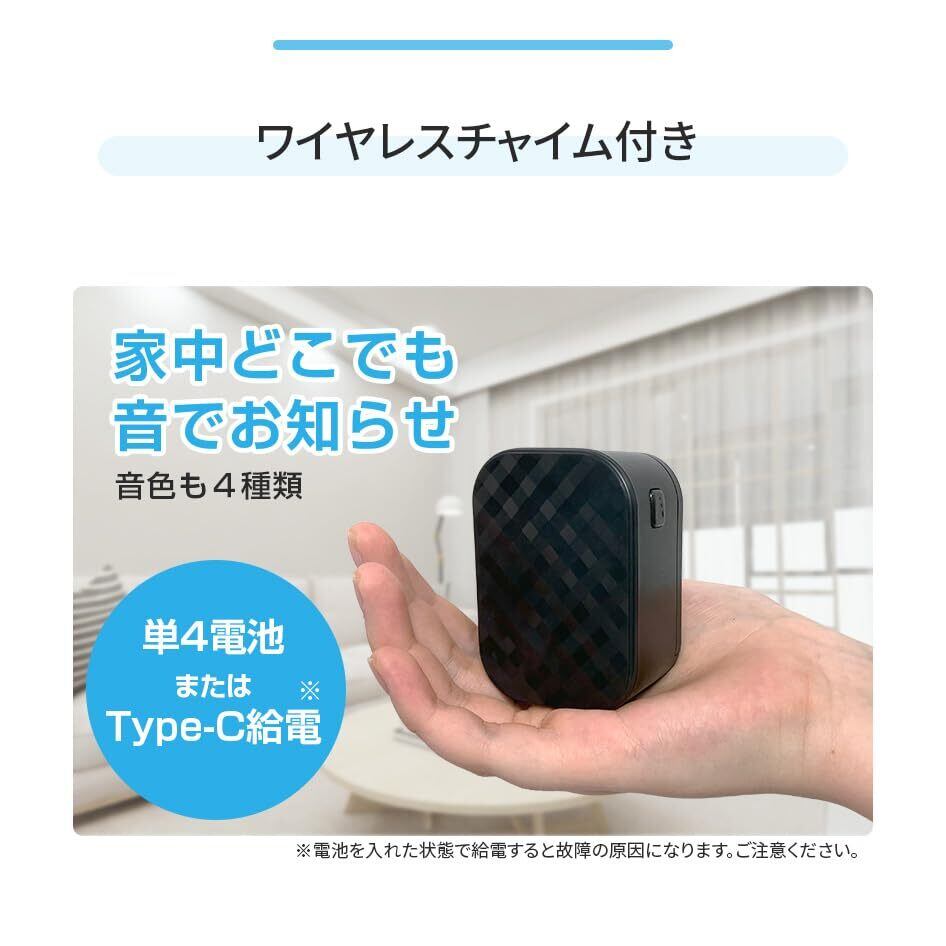 【ワイヤレスチャイムセット】ドアベルが鳴ったら音でお知らせしてくれるワイヤレスチャイムがセットになっているお得セット。音量は4段階で調節することができ、チャイム音も4種類から選択可能。単4電池3本で稼働するので、どこでも設置が可能です。