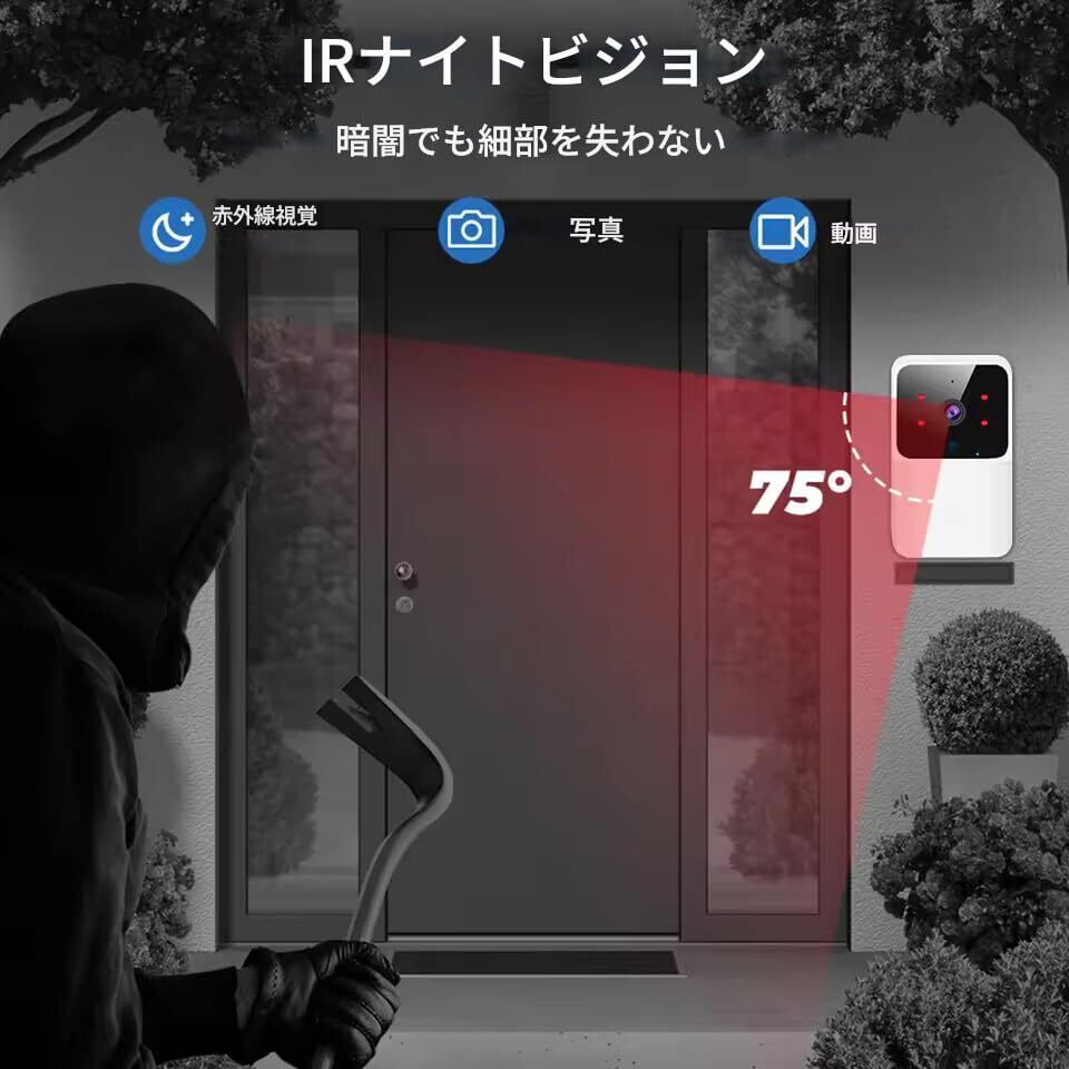 長時間スタンバイ: 分解サイクル充電不要。内蔵リチウムイオン大容量バッテリー、長時間スタンバイ。ドアベルは内蔵の大型バッテリーで駆動するため、頻繁に充電する必要はありません。チャイムはUSB電源で、使いやすく便利です。 ビデオ通話: 訪問客への対応が簡単。誰かがドアベルを押すと、ドアベルは電話にプッシュ通知を送信し、所有者は電話のビデオ会話インターフェースに入ることができます。 ポータブルインストール: 貼り付けと穴あけが可能。粘着性の裏地をサポートし、穴あけが不要で、穴あけインストールもサポートしています。差し込み不要で、便利で手間がかかりません。 キャプチャ画面: クラウドに保存、セキュリティ保護は滴下。訪問者がドアベルを押すと、訪問者の写真をキャプチャしてクラウドに記録を保存できるため、携帯電話のアプリでいつでも過去の写真を表示でき、より安全で安心です。