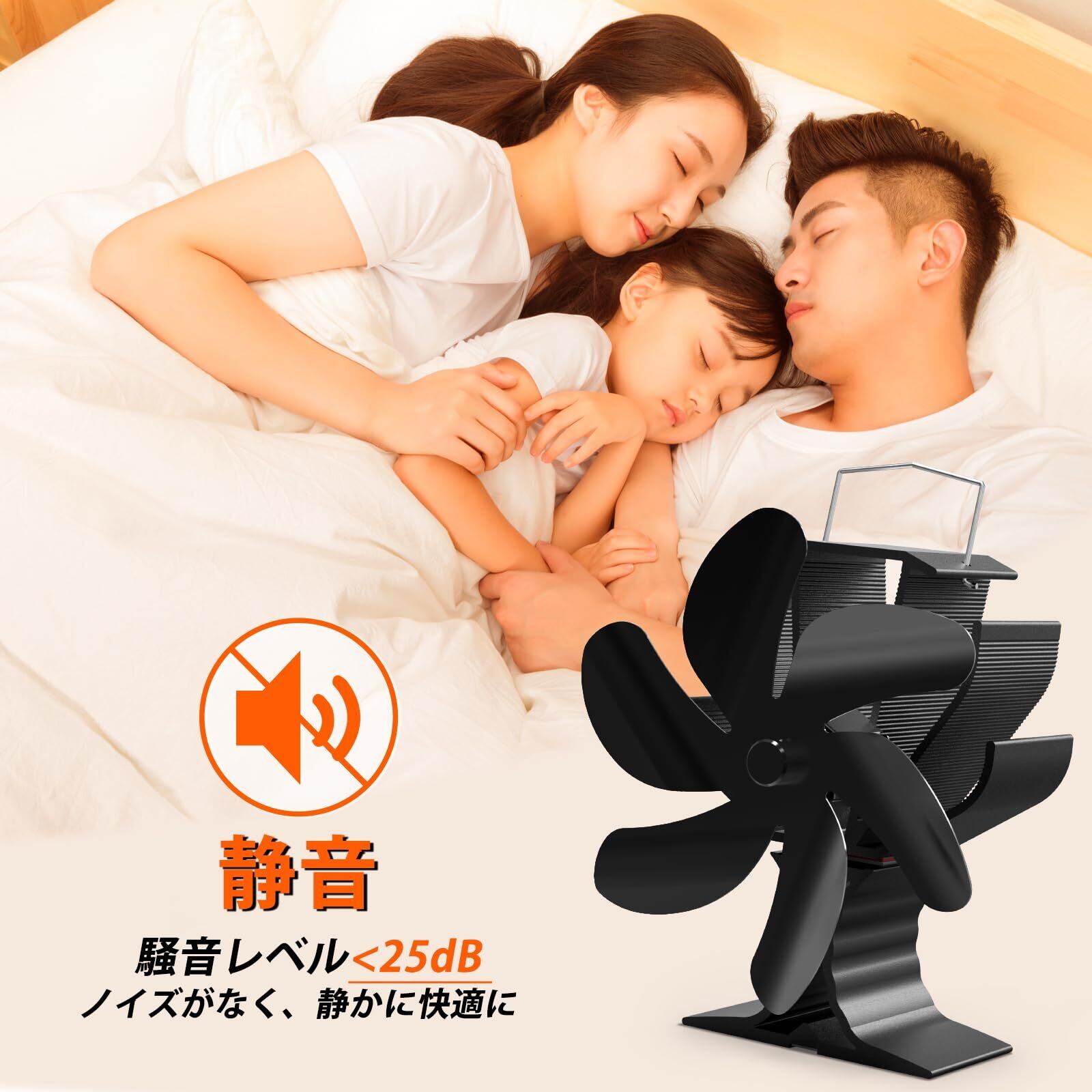 【 6つブレード・静音 】 ストーブファンの設計が全体的な最適化を達成するために、羽根の形状、数量、厚さと土台の高さを繰り返してテストします。石油ストーブファンの6つブレードは大面積の曲げ加工で、折り曲げ角度は約25度で風量が強い!最大回転速度は1440RPMです!空気抵抗を減らして、風速の変動幅も小さく、バランスの取れた「穏やかな風」を送らせます。使用中の騒音レベルは約25dBで、木の葉のふれあう音に近く非常に静かで、眠りの妨げになりません。