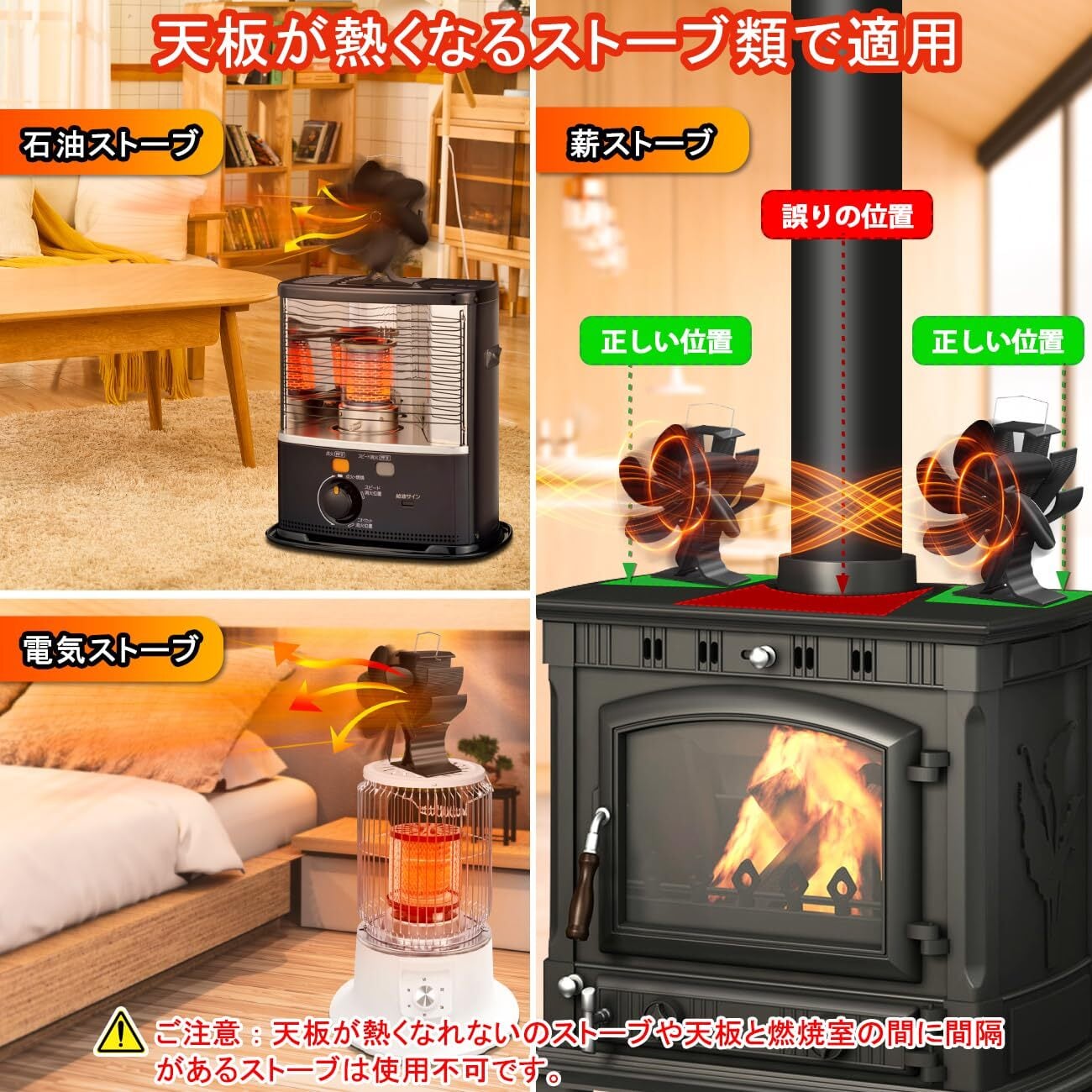 【 室内・キャンプ・登山 】 電源いらずで、場所を問わず使えます。普段使われている薪ストーブや対流式ストーブの上に置いて、熱発電の力を利用してストーブ用ファンが回り始めます。石油ストーブ、レインボーストーブ、灯油ストーブ、アラジンストーブ、アルパカストーブ、ベレットストーブ、ガスストーブ、キャンプのストーブなど天板が平で熱くなるストーブに幅広くお使い頂けます。さらには埋め込み式暖炉に簡単に配置できます。