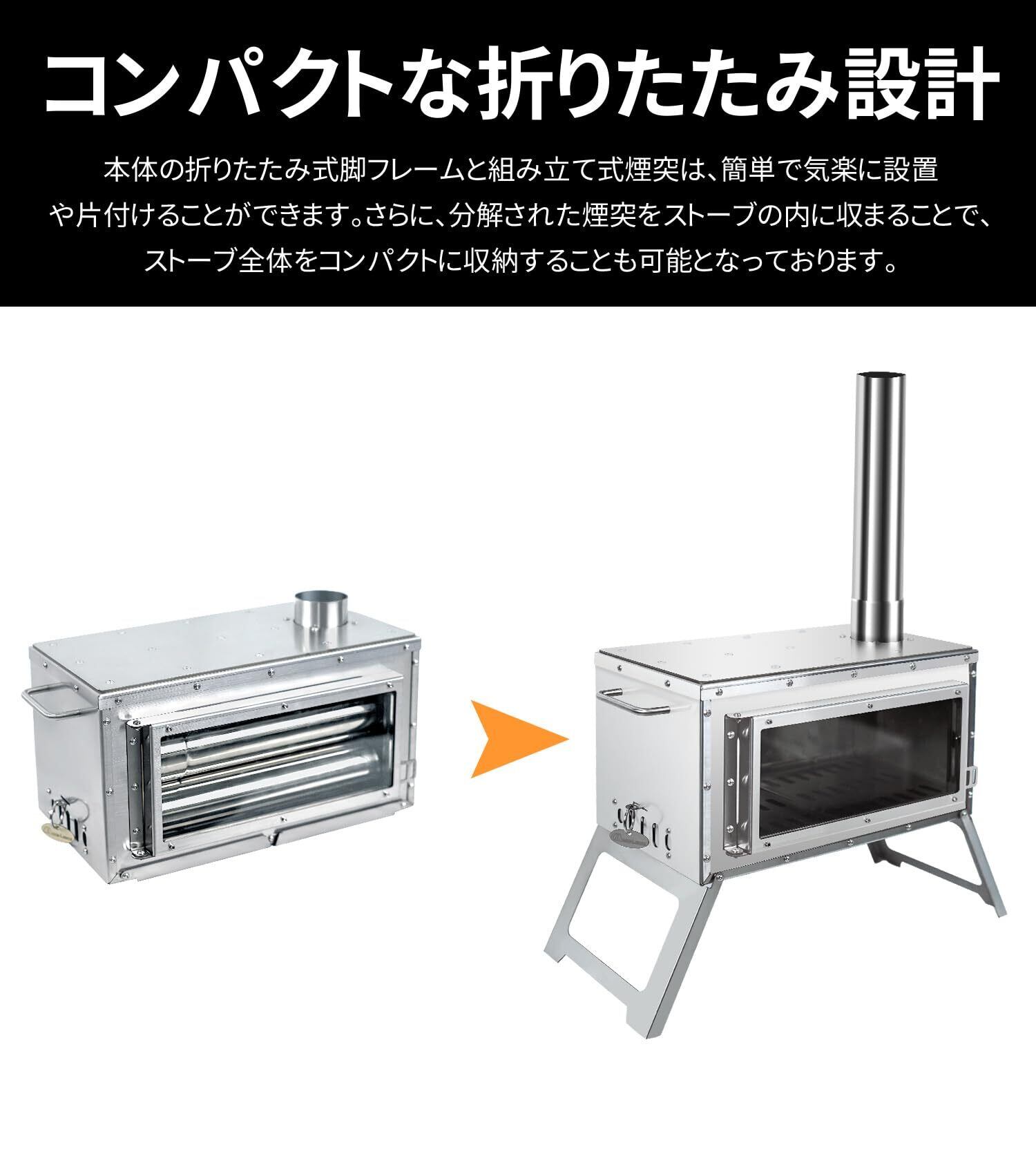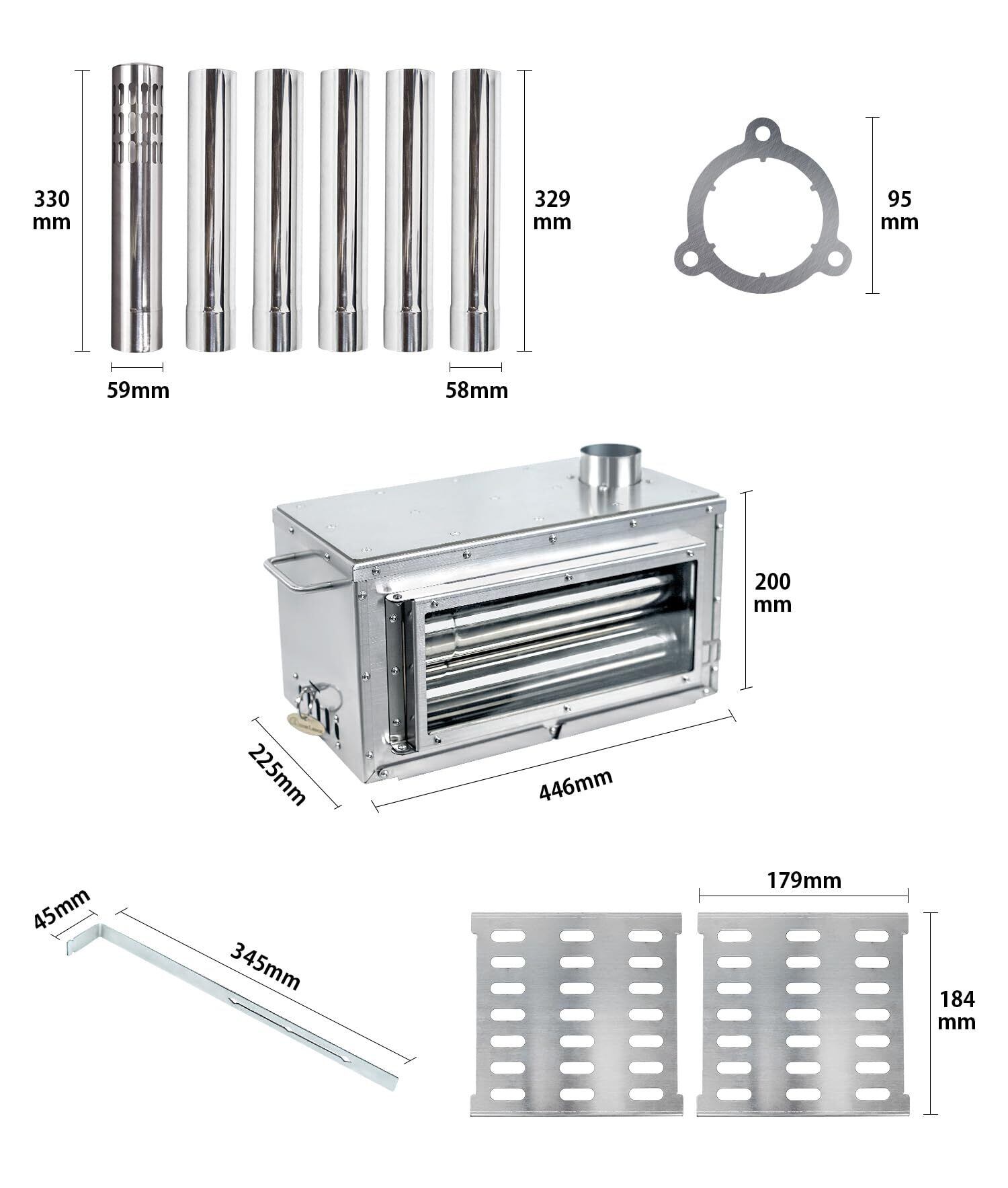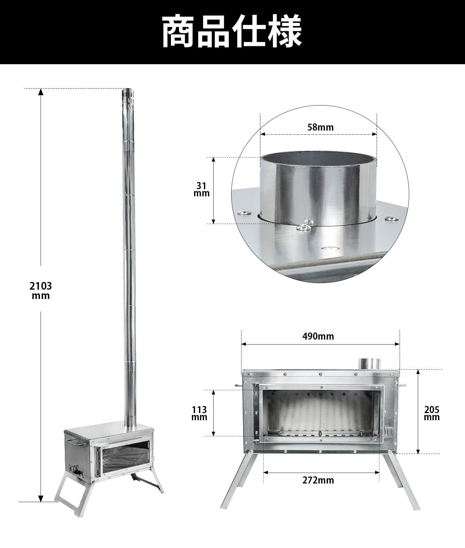 【商品仕様】●展開サイズ(約):W490mm × D205mm ×H 2103mm ●燃焼室サイズ(約):W375mm × D200mm × H170mm ●煙突パイプ:長さ329mm × 直径58mm(オス直径57mm、メス直径59mm) ●収納サイズ(約):W446mm × D225mm × H200mm ●重量(全煙突含め):8.25KG ●材質:ステンレス