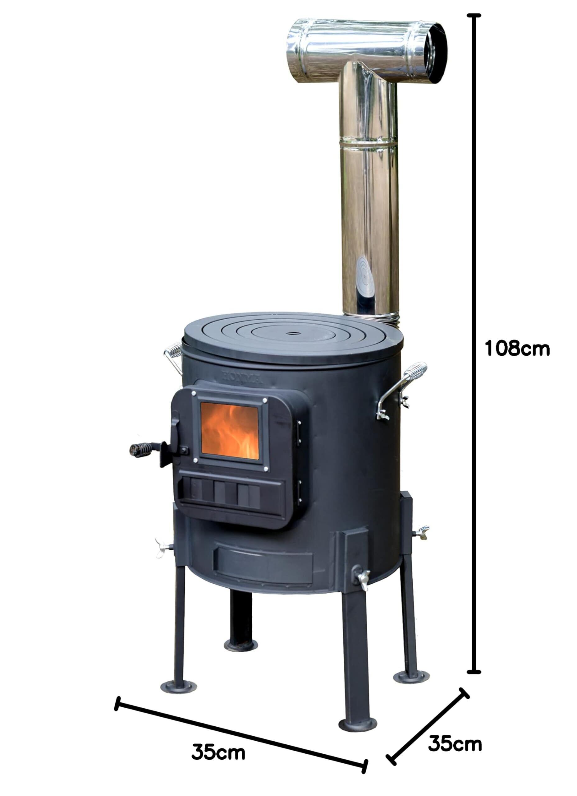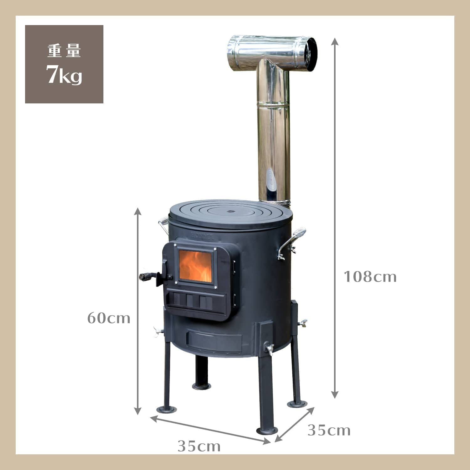【仕様】本体サイズ:φ350x高さ600(煙突含:1080)mm、煙突サイズ:φ100mm、本体重量7kg、本体材質:亜鉛メッキ鋼板/煙突材質:ステンレス、原産国:日本