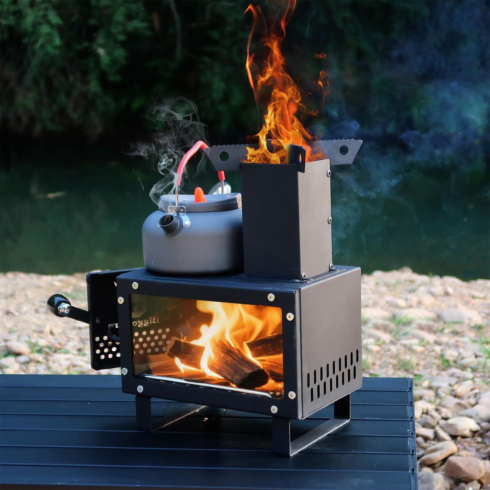 【大きなガラス窓付き】このコンパクトストーブモデルは、側面が大きな窓(側面耐熱ガラス窓サイズ190*95mm) 、窓は微結晶耐熱ガラスを採用、熱に強く(耐高温860°C)、何時までもきれいに見え、ホコリを残せず、黒くなることなく、コンパクトストーブの中の薪の状態を確認しやすいだけでなく、炎のゆらめきをたっぷり楽しめます。また、ストーブ中の薪や火力を確認することもでき、揺らぐ炎を眺めながらゆっくり過ごす時間は格別です。ストーブは屋外照明としても使用できます。このミニ薪ストーブがあれば、アウトドアの夜をムード満点に楽しめます。