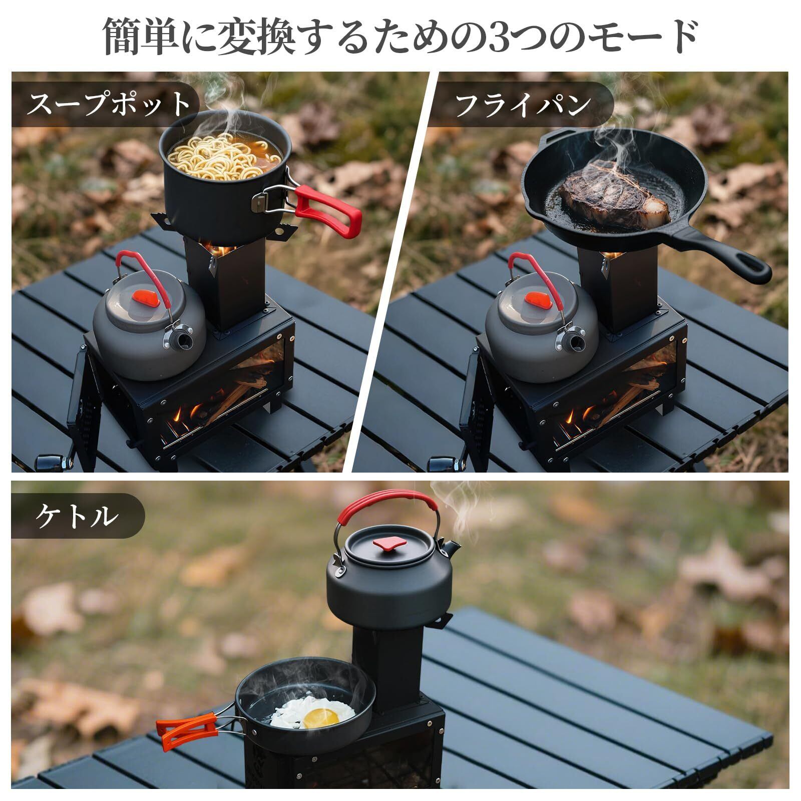 【調理が簡単】やかん、鍋、フライパン、オーブンなどが置ける大型クッキングヒーター。調理も湯沸かしもできます。クロススタンドとワイドな火格子で、安定した足場を提供します。